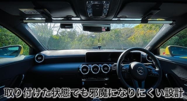 A1:基本的には設置しても視野の妨げにはならないことやフロントガラスへの取り付けなどは無いため問題はないと判断しておりますが、『道路交通法』第55条第2項の規定により運転中にドライバーの視野を妨げるものを設置してはいけないため、車種などにより万が一妨げになると感じた時など運転時は取り外して走行したほうが良いと思われます。なお、本体はサンバイザーより約5cm下に配置されるイメージです。