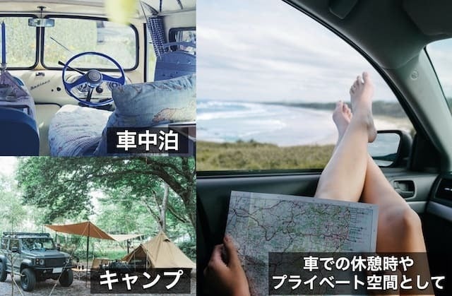 キャンプや車中泊、パーキングで駐車した際などに使用すればフロント部分からの視線が遮られ、あっという間にプライベート空間にすることができます。