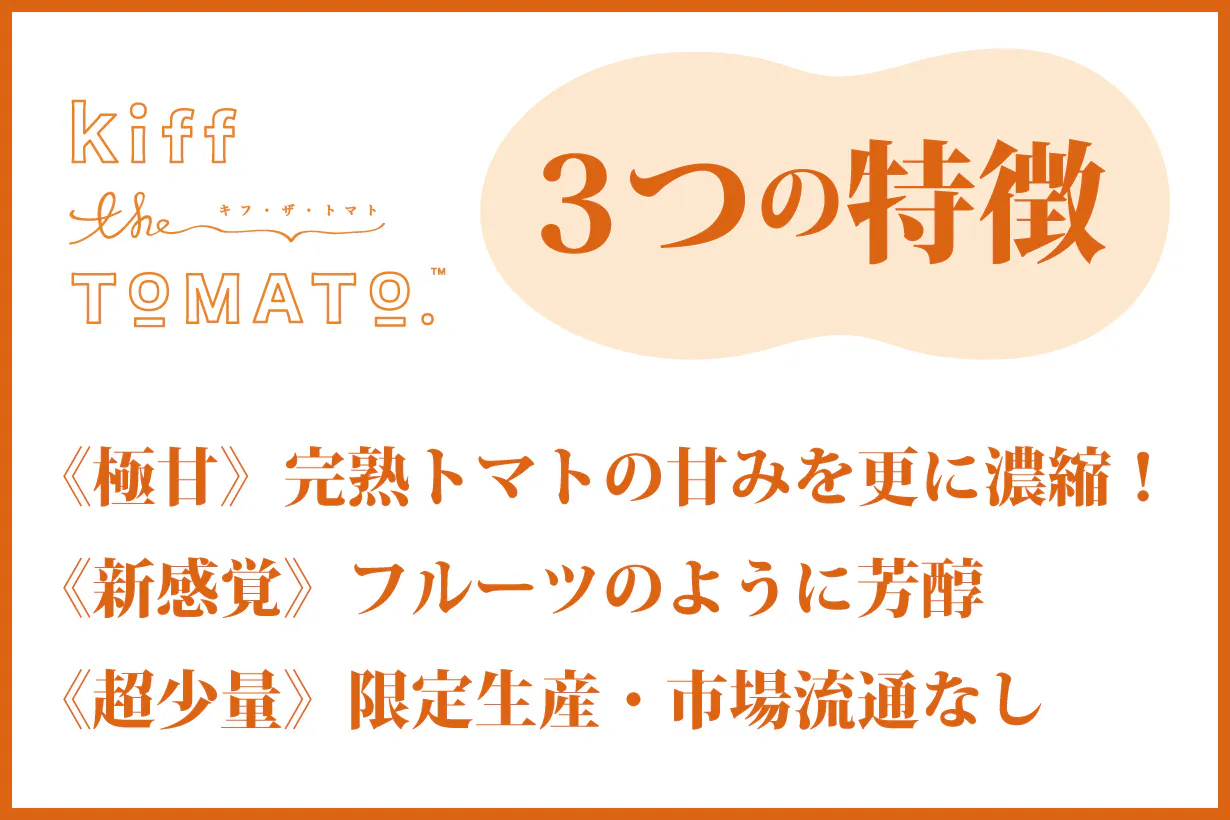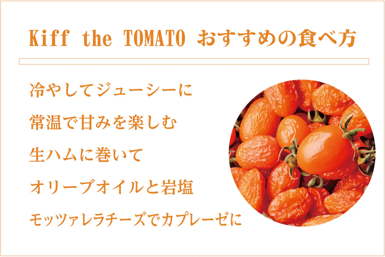 ワイン好きの間で知られている「貴腐ぶどう」を思わせるような、甘みの凝縮された芳醇で濃厚な味わいの果肉。これを楽しんでほしいという思いから「Kiff the TOMATO」という商品名を付けました。