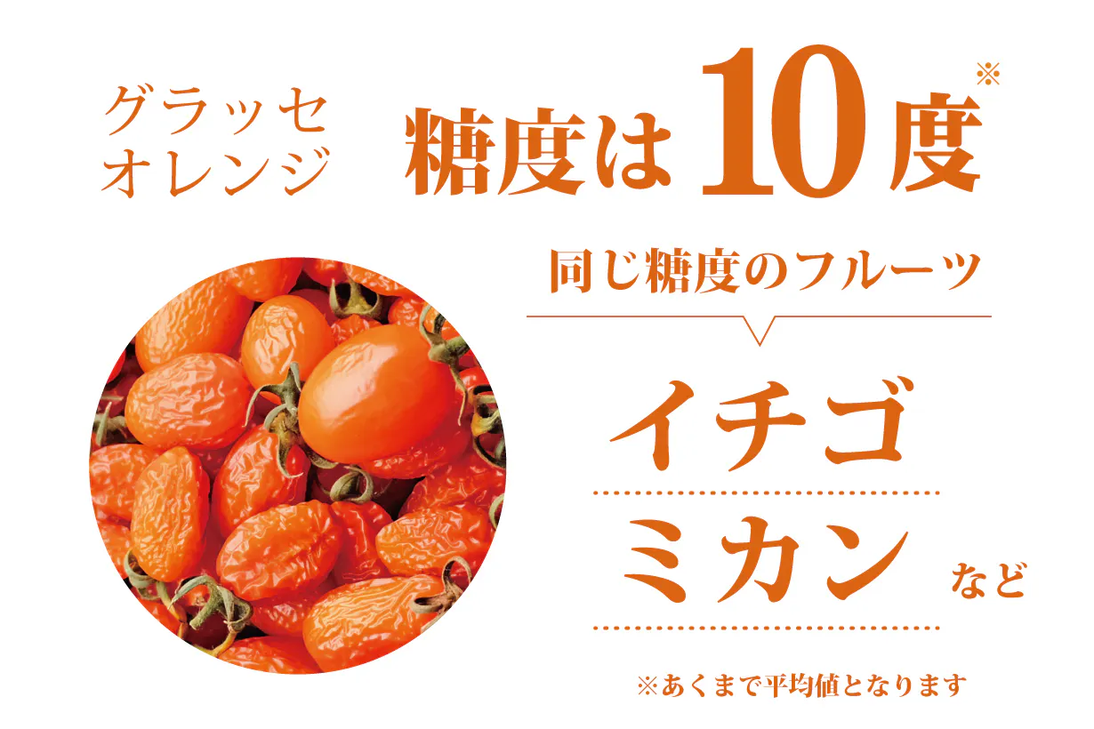 鮮やかに色づきしたグラッセオレンジ。甘さと旨味が濃いです。少しシワが入ってKiff the TOMATOになり始めているものも。