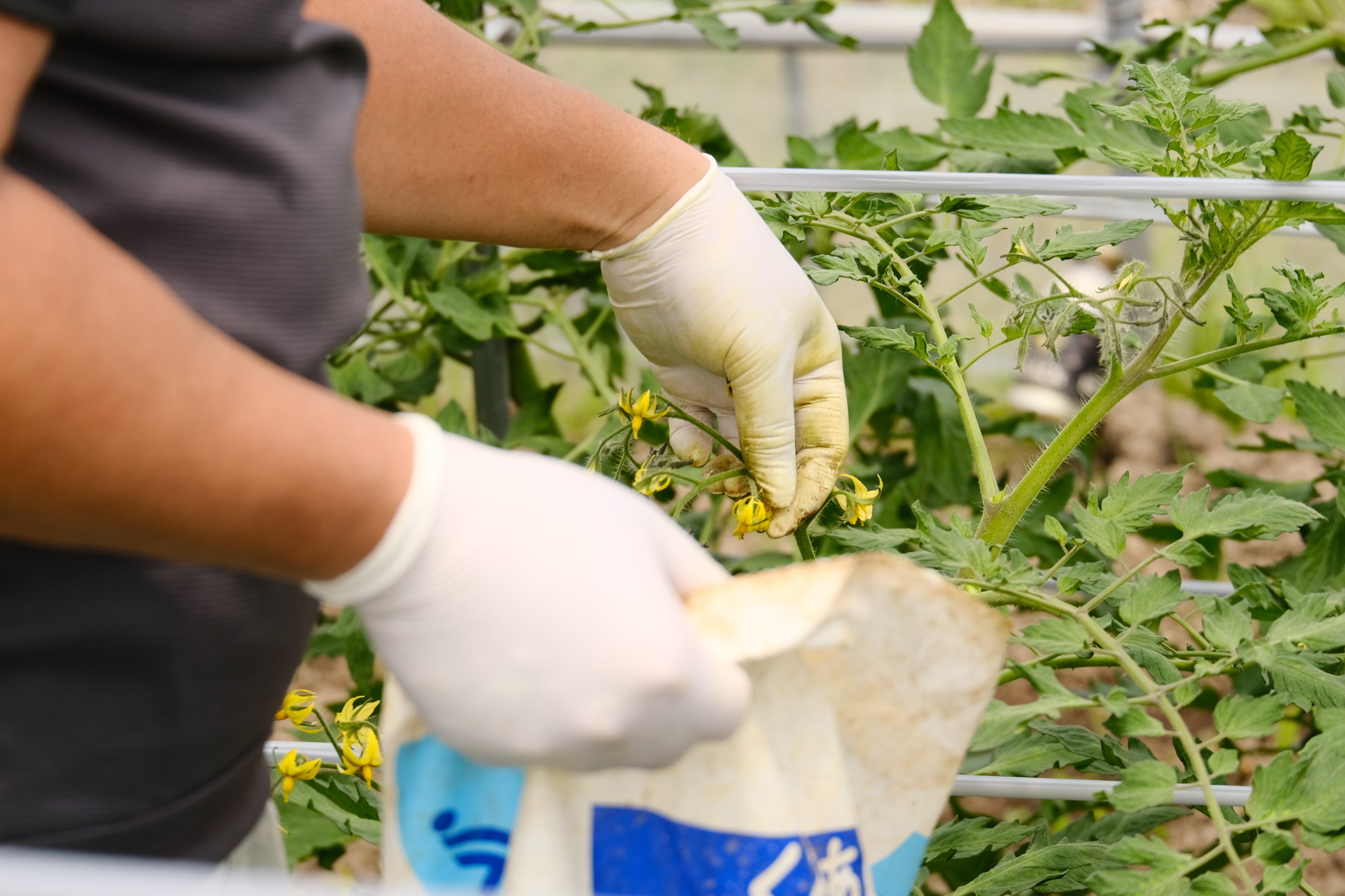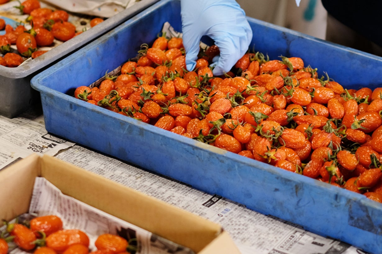 Kiff the TOMATOは非常にデリケートなため、収穫後の選別作業も一粒ずつ手作業で行い目視で状態を確認しています。