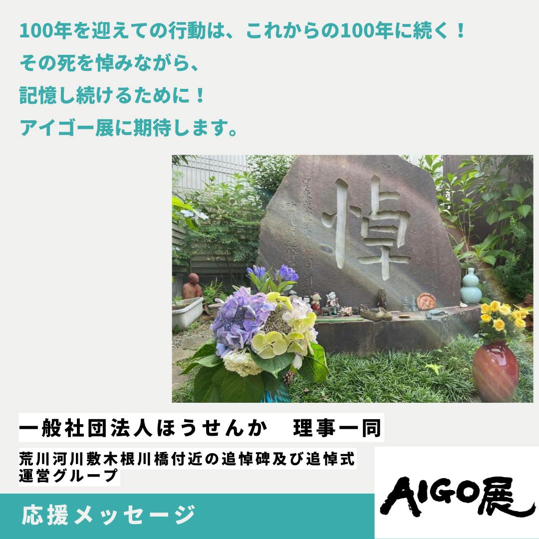 一般社団法人ほうせんか 理事一同(荒川河川敷木根川橋付近の追悼碑及び追悼式運営グループ)さんからの応援メッセージを紹介します!