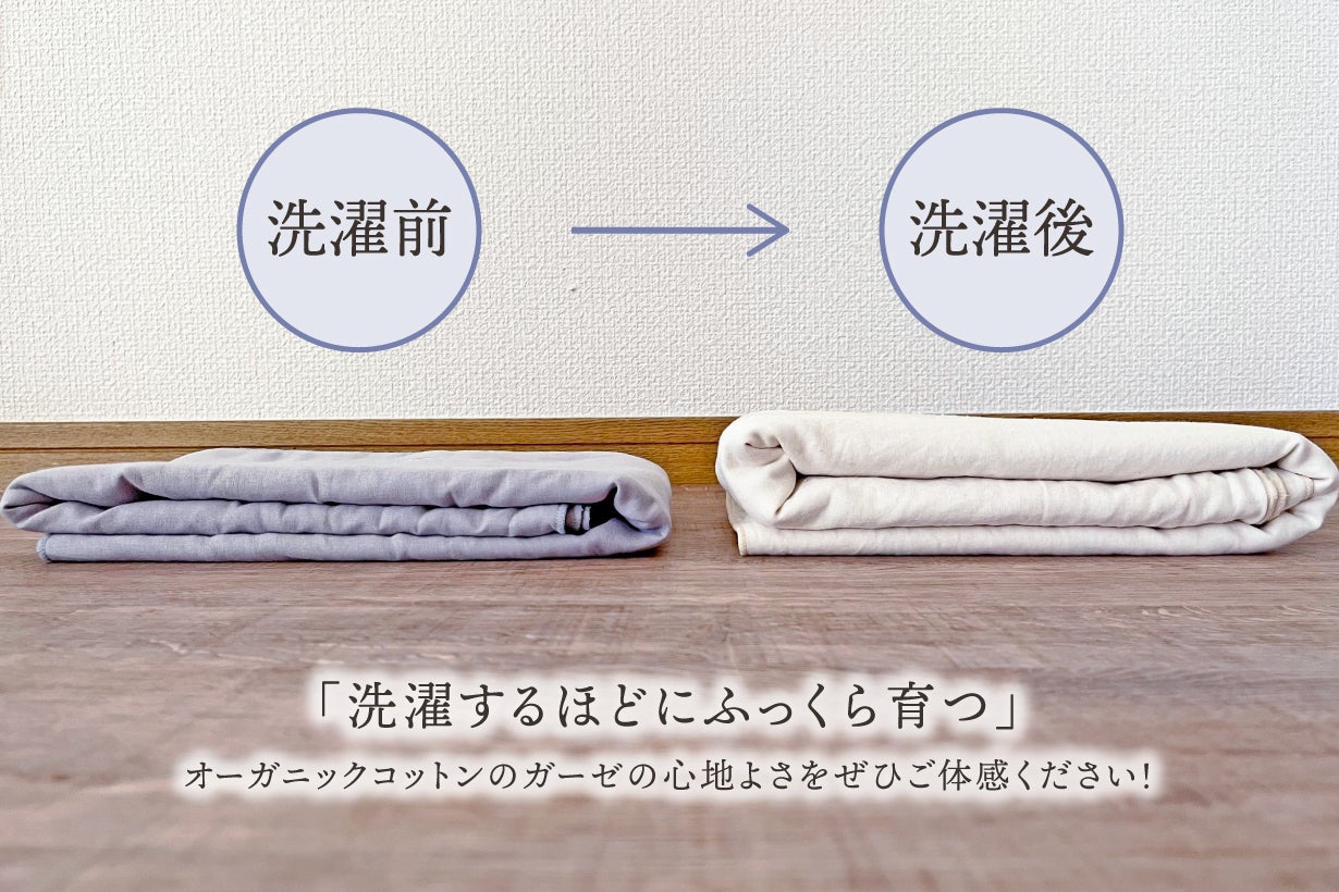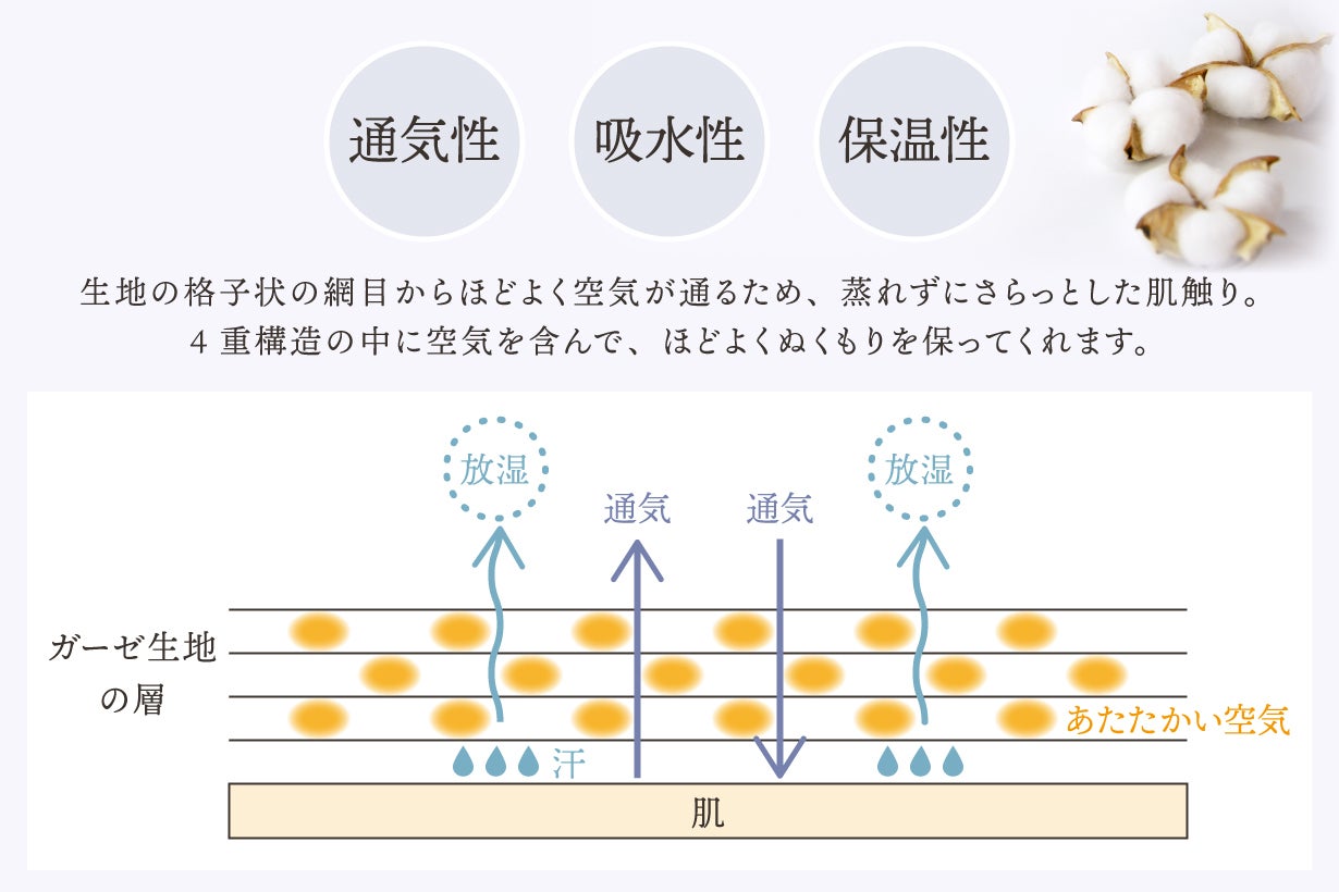 肌に優しい素材を用い、ふっくら柔らかい和さらし製法で作られたガーゼ生地は、優しい肌触りです。洗濯するほどにふっくら育っていくガーゼ生地。その心地よさをぜひ味わってみてください!