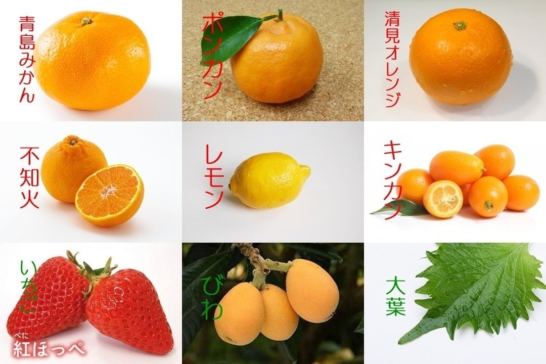 青島みかん/ポンカン/清見オレンジ/不知火/キンカン/いちご/びわ/大葉/にんじん/桜