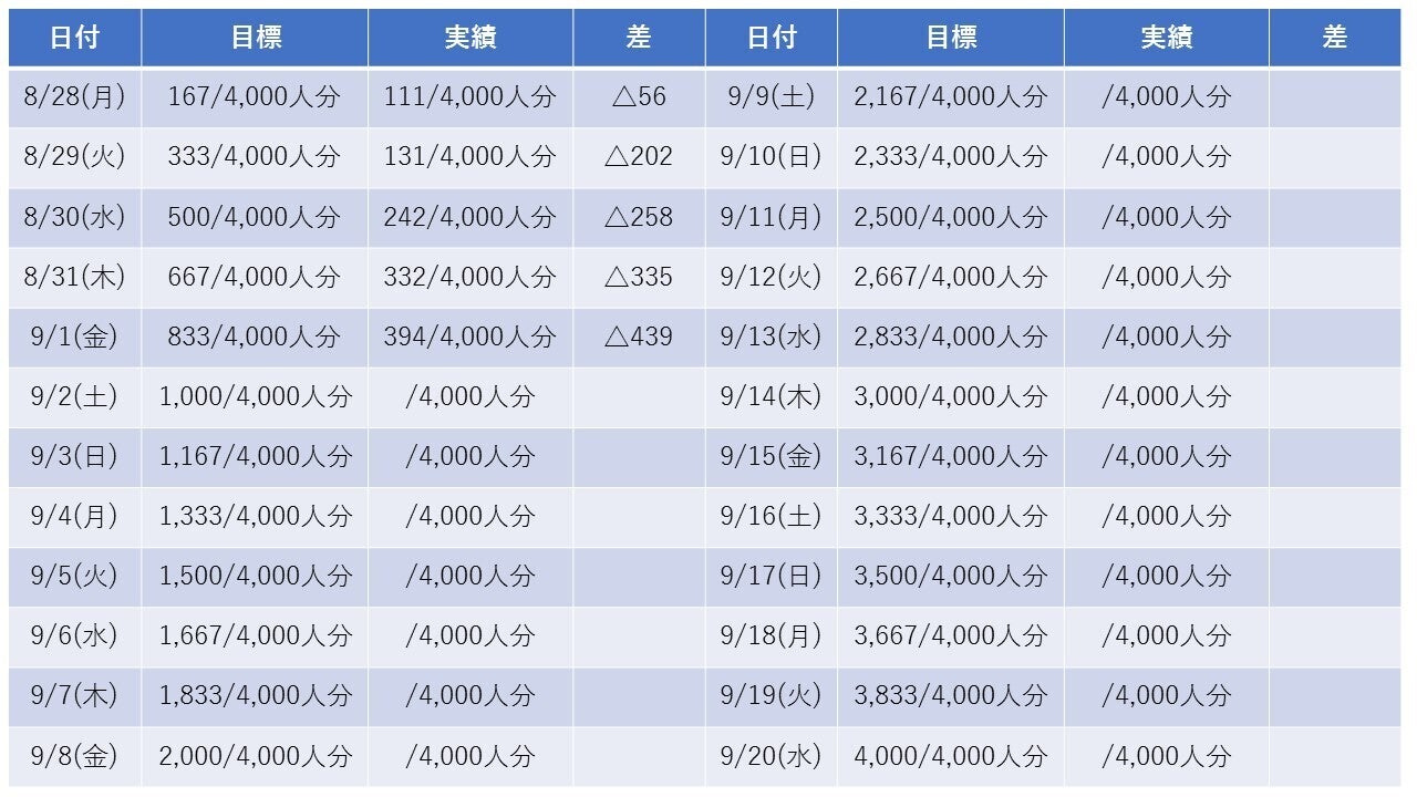 日々の目標は単純に最終目標人数を日数で割ったもので約167人/日となっております。