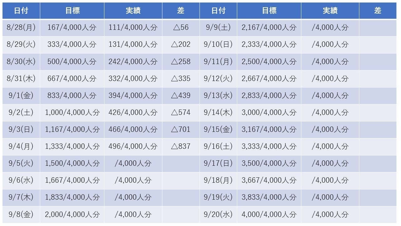 日々の目標は単純に最終目標人数を日数で割ったもので約167人/日となっております。