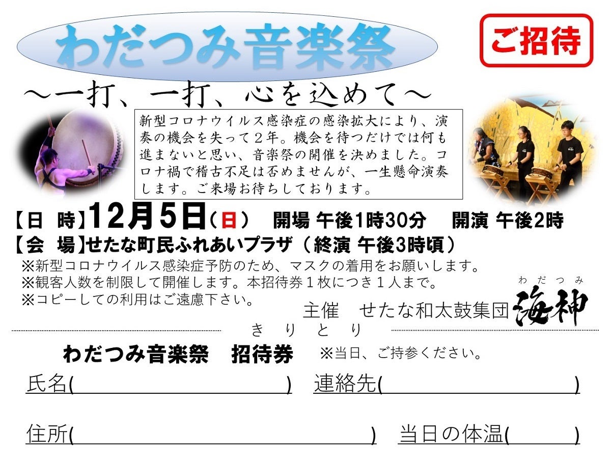 演奏の機会を待つだけでは何も進まないとの思いから、2021年12月に海神のみ出演の「わだつみ音楽祭」を招待制により主催開催。定期演奏会という位置付けで年1回開催することとし、2022年12月にも開催しました。