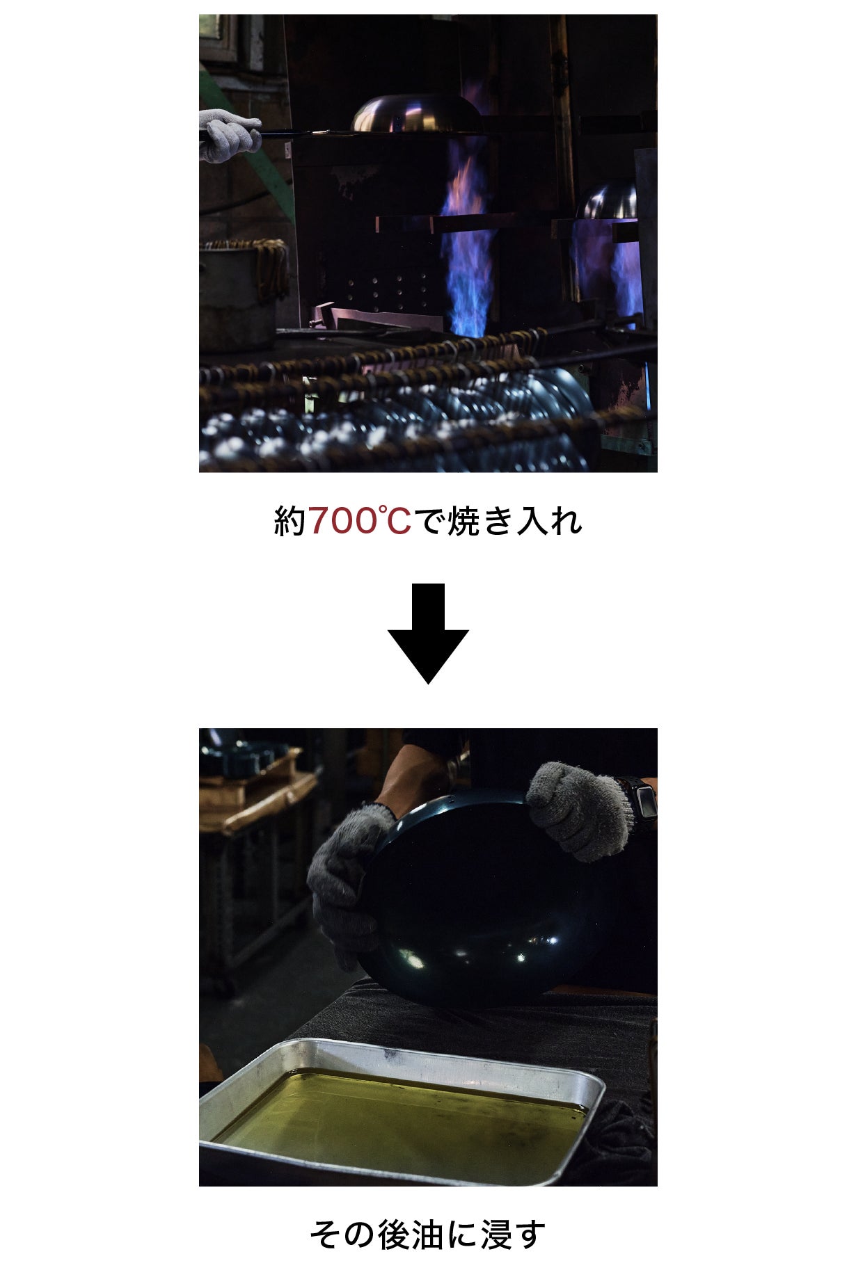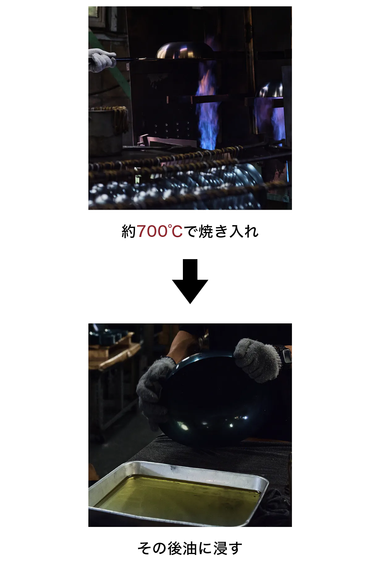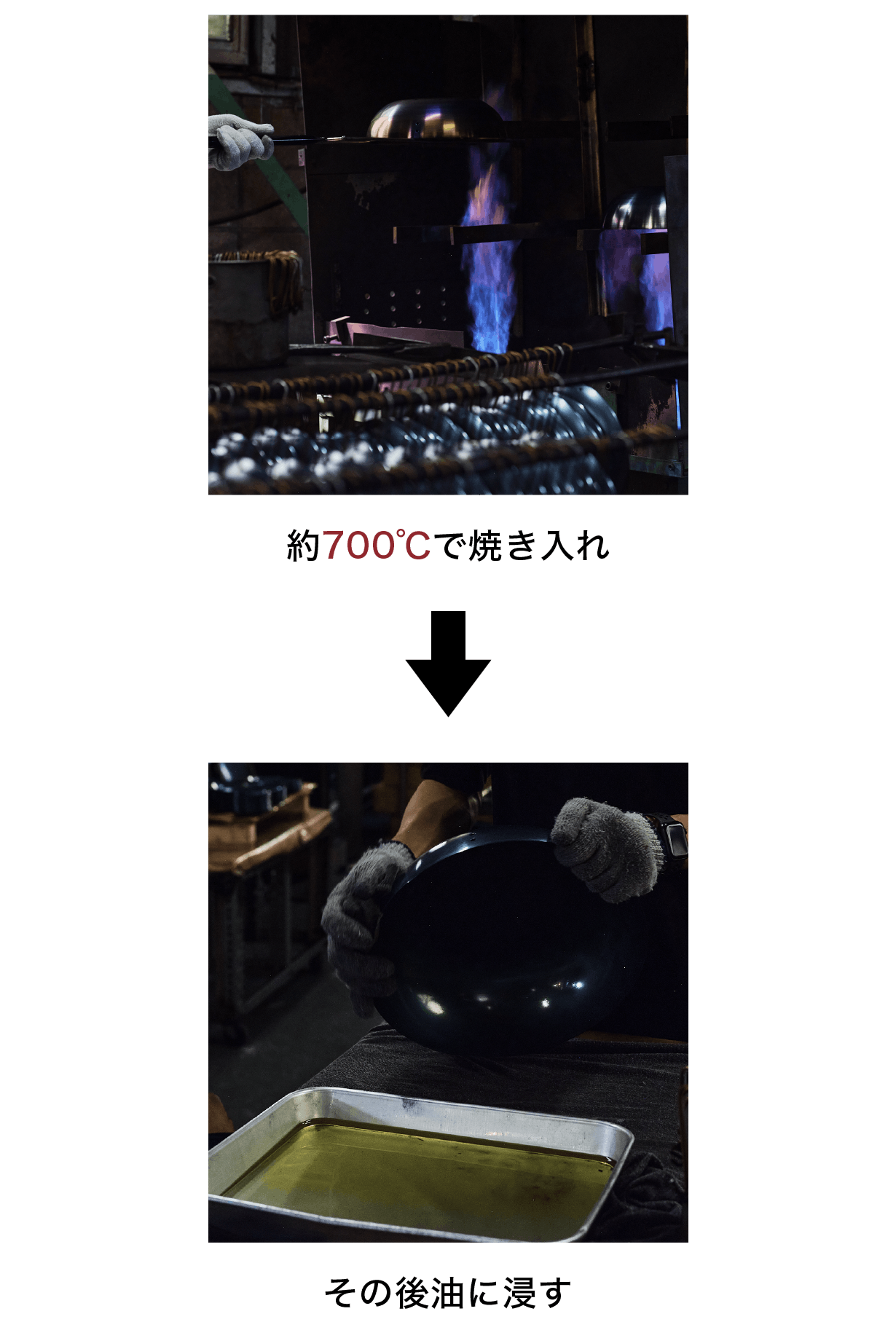 本体を一つ一つ約700℃で焼き入れ、その後油に浸すことにより初めの状態から油が馴染んだものです。