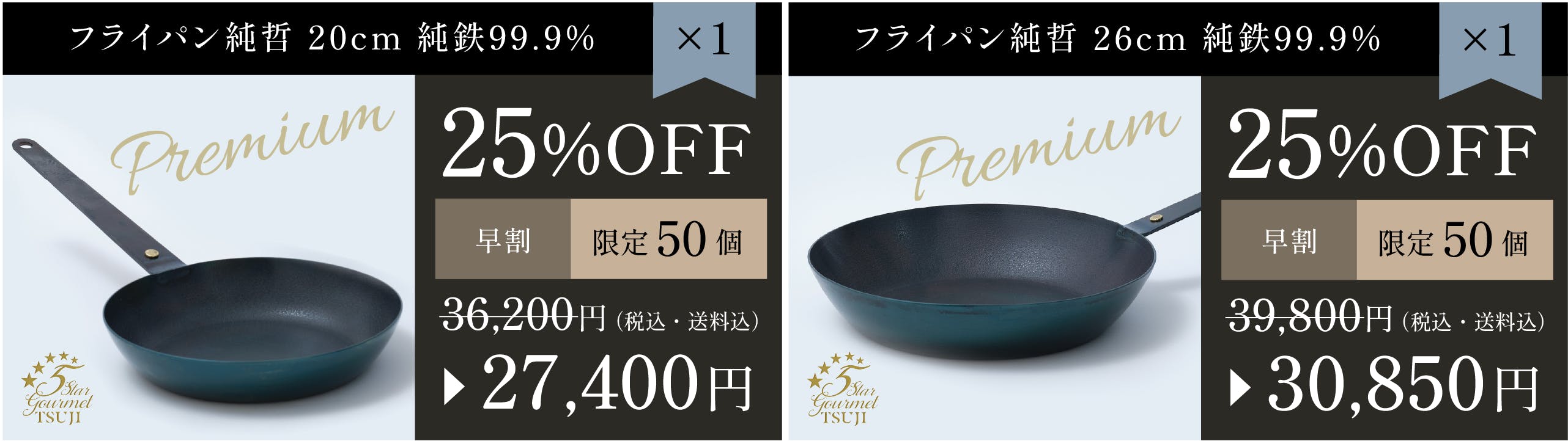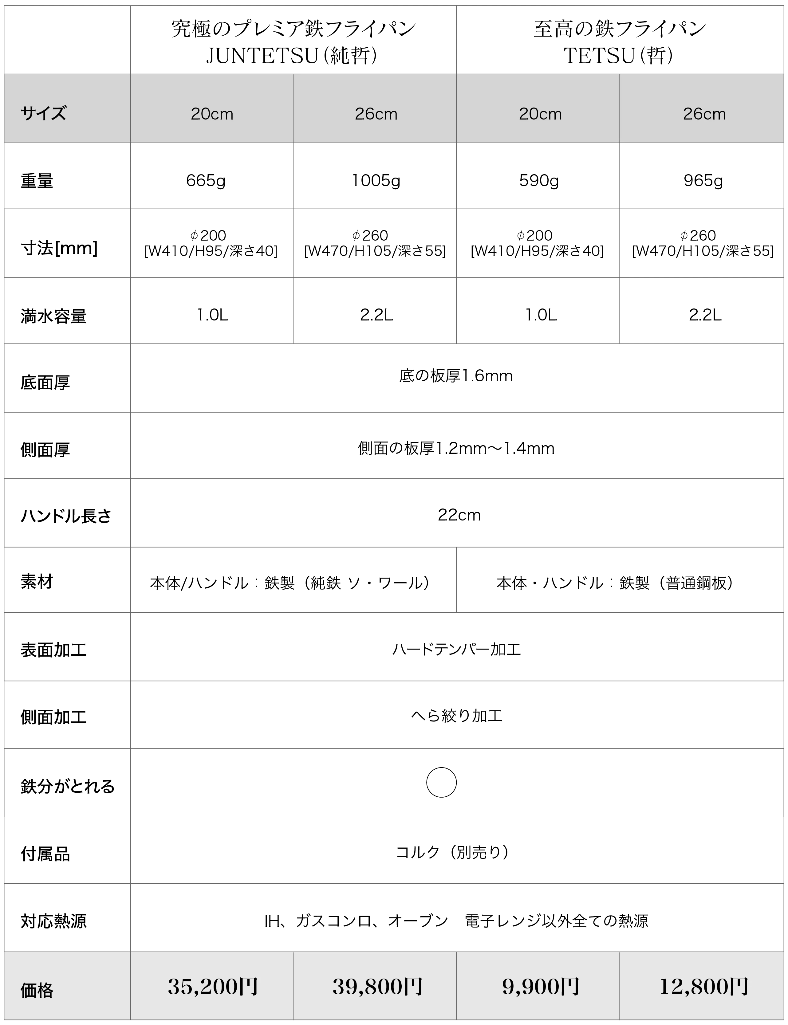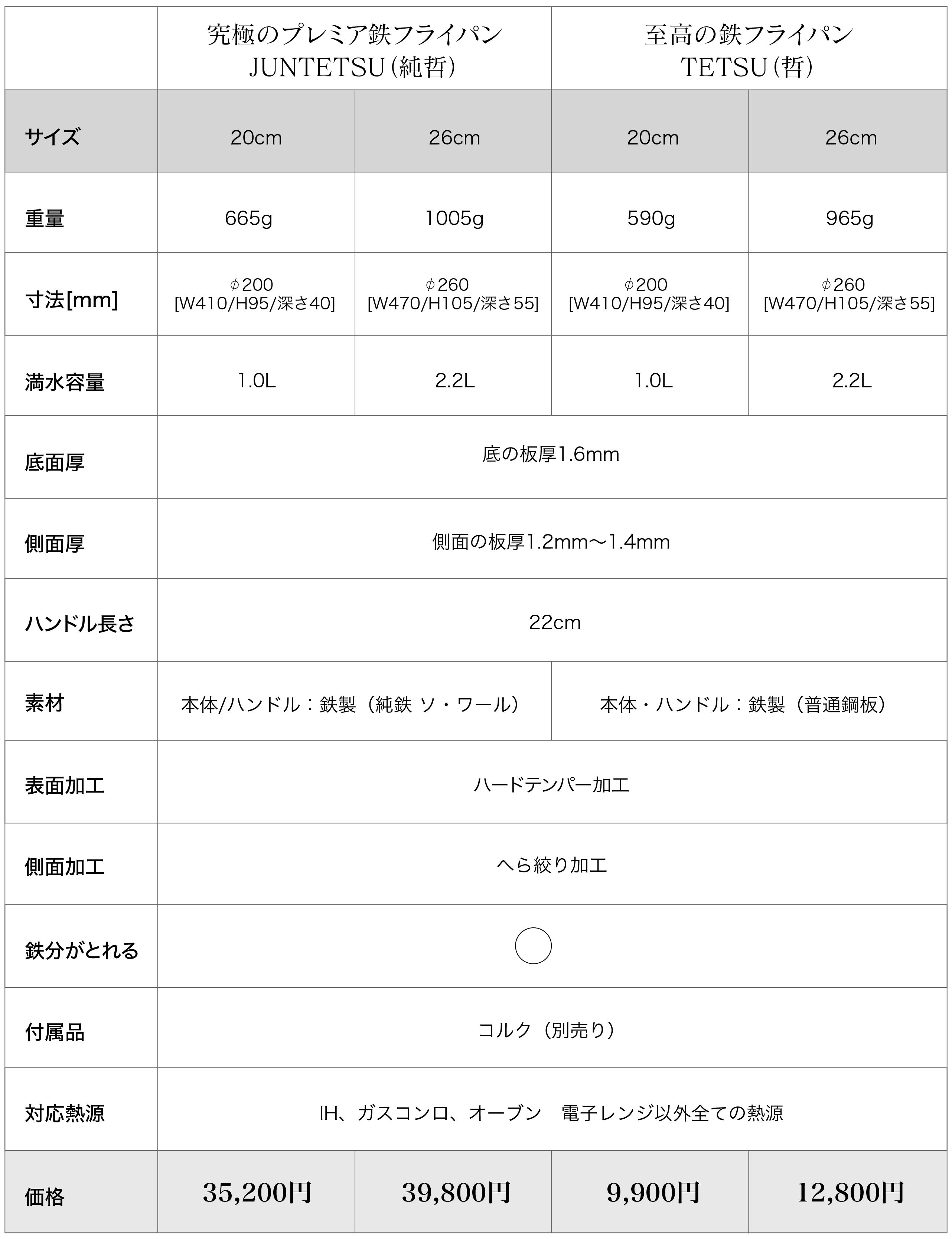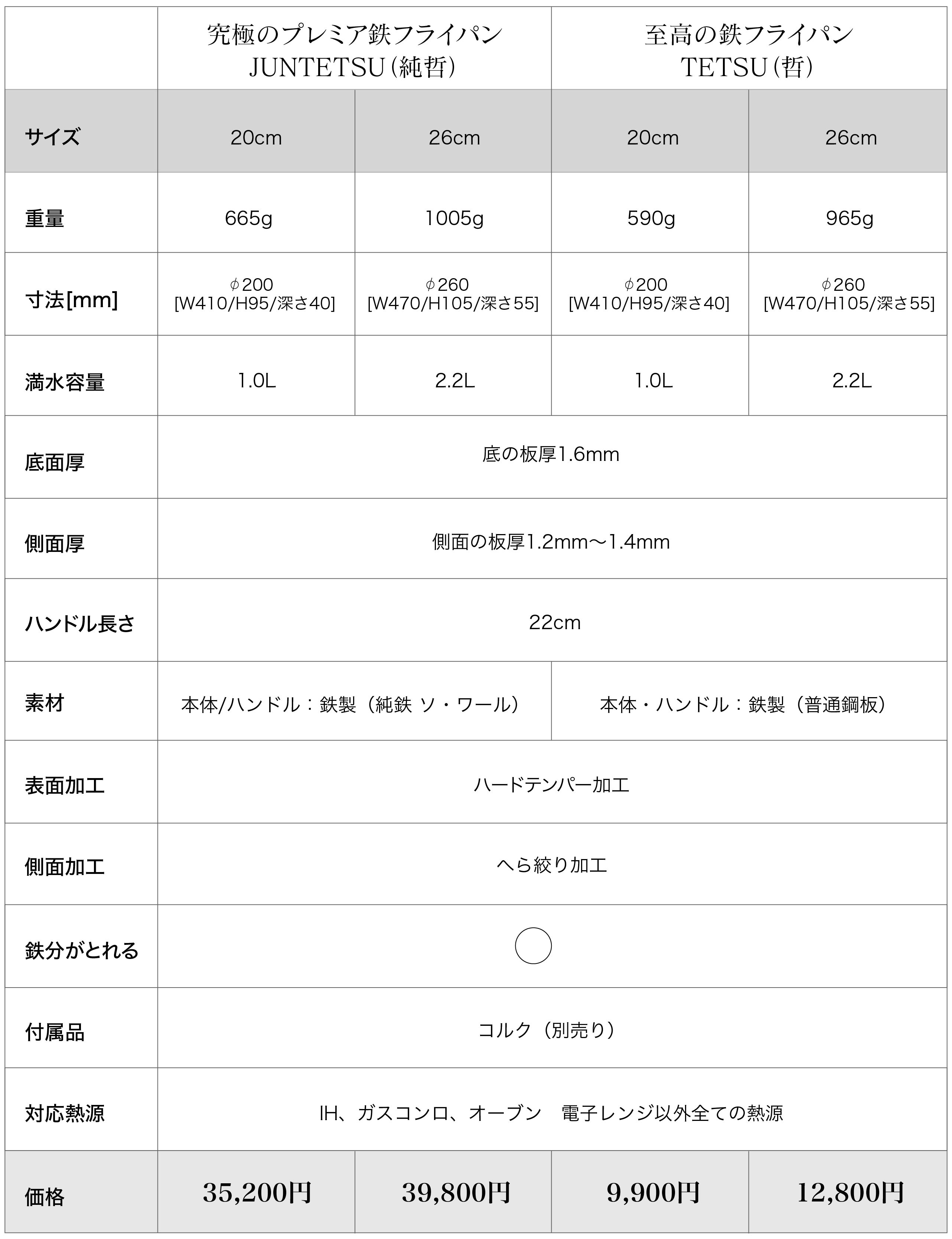 Q: 辻哲弥の至高の鉄フライパン哲(TETSU)と究極の鉄フライパン純哲(JUNTETSU)にはどのような違いがありますか?