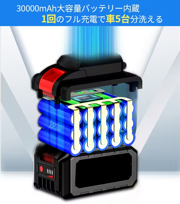 取り外し式の30000mAh大容量バッテリーを内蔵、コンセントによる使用場所の制限から解放!たった1回のフル充電で最大60分連続稼働でき、車5台分も一気に洗えます。