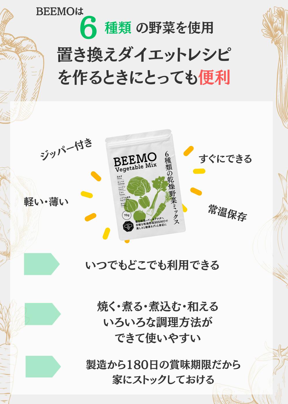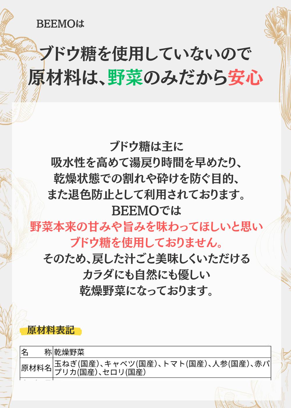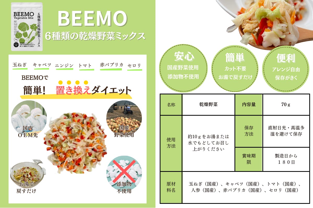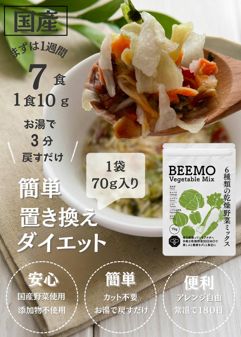 BEEMOは、忙しい現代のライフスタイルに合わせた、便利で栄養豊富な乾燥野菜ミックスです。