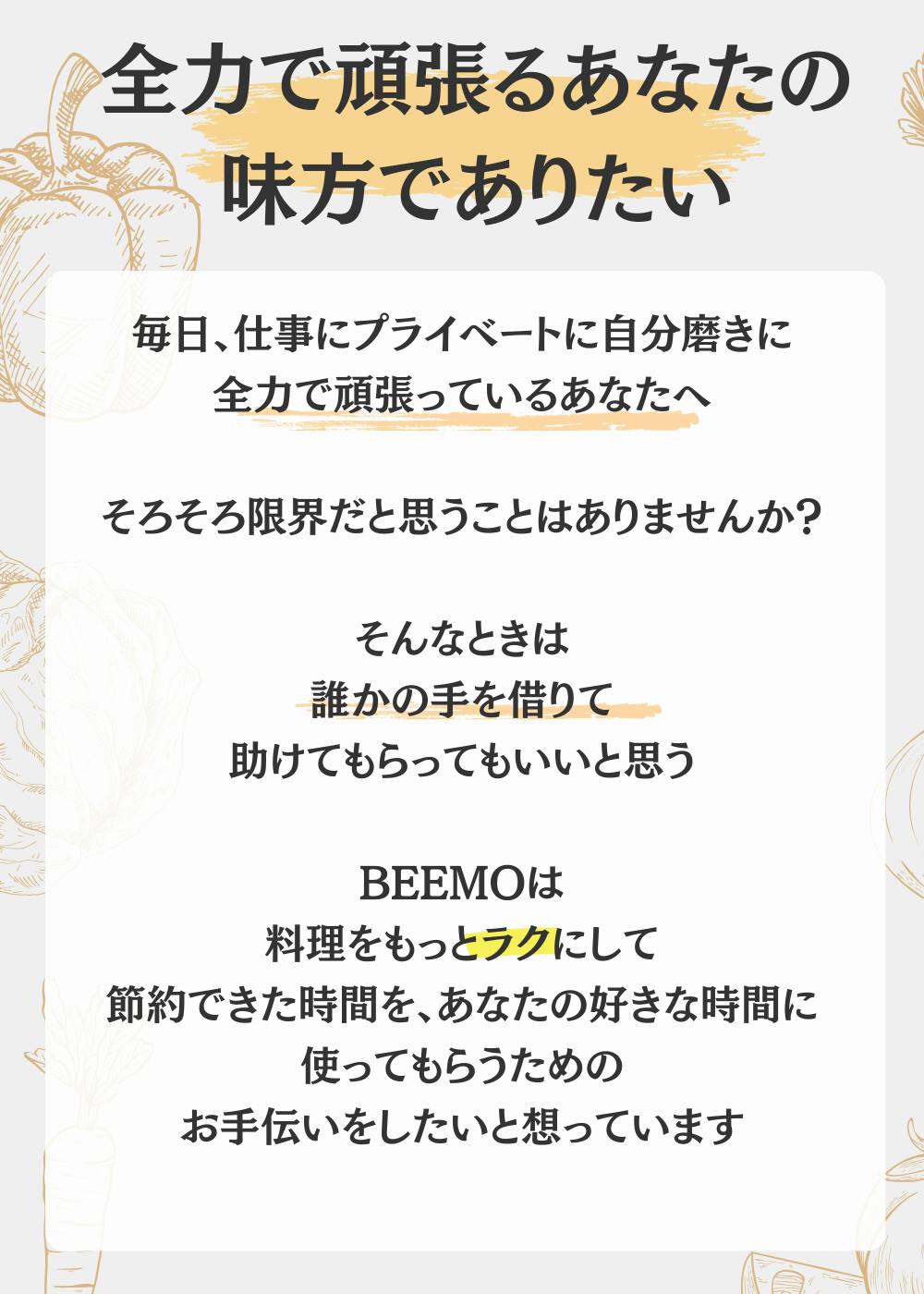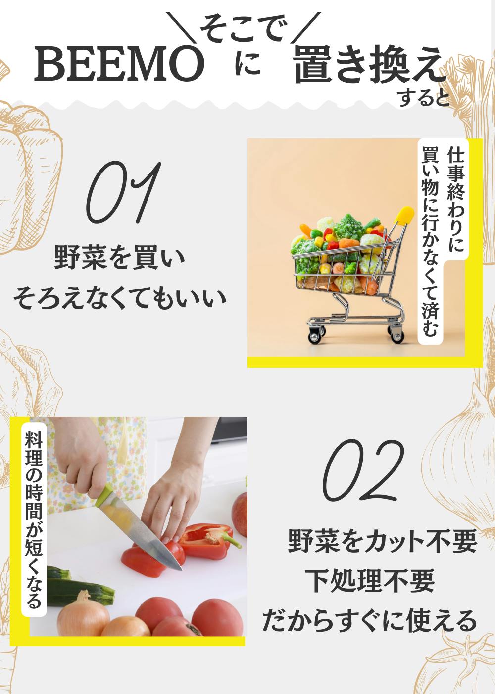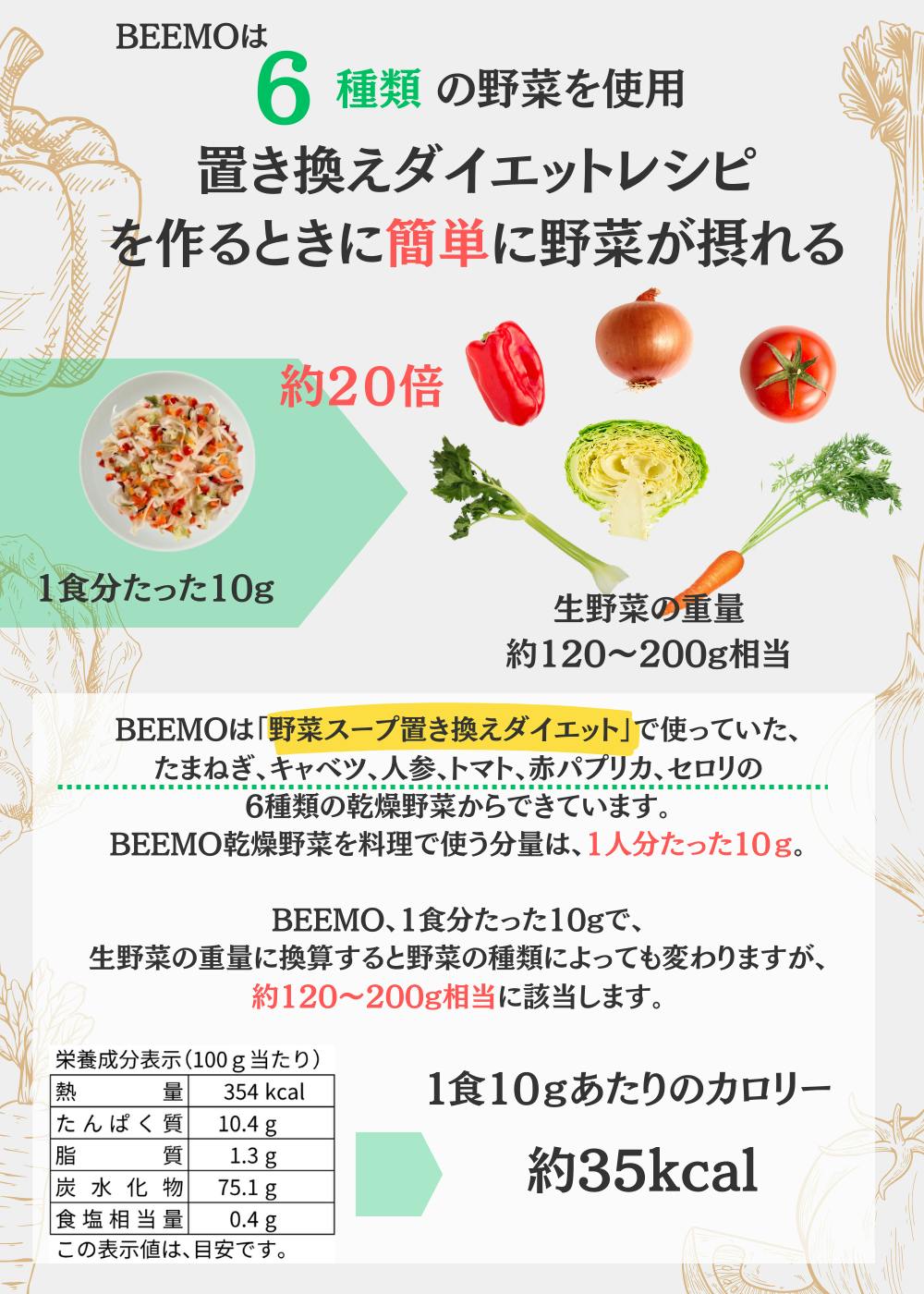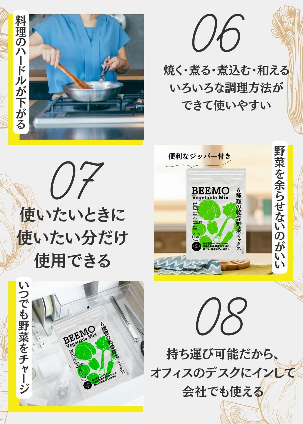 BEEMOは、忙しい現代のライフスタイルに合わせた、便利で栄養豊富な乾燥野菜ミックスです。