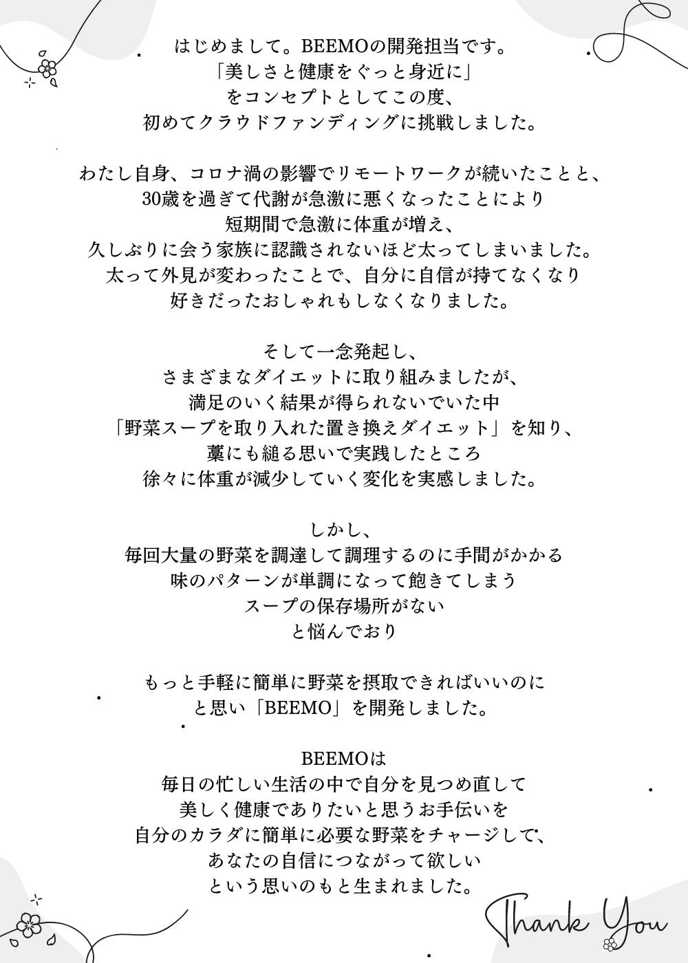 今回のプロジェクトで行いたいことは、ひとりでも多くの方にBEEMOを知っていただき、そして使っていただいて健康になっていただきたいと思っております。また、国内に限らず世界中の方々にBEEMOを知っていただきたいと思っております。