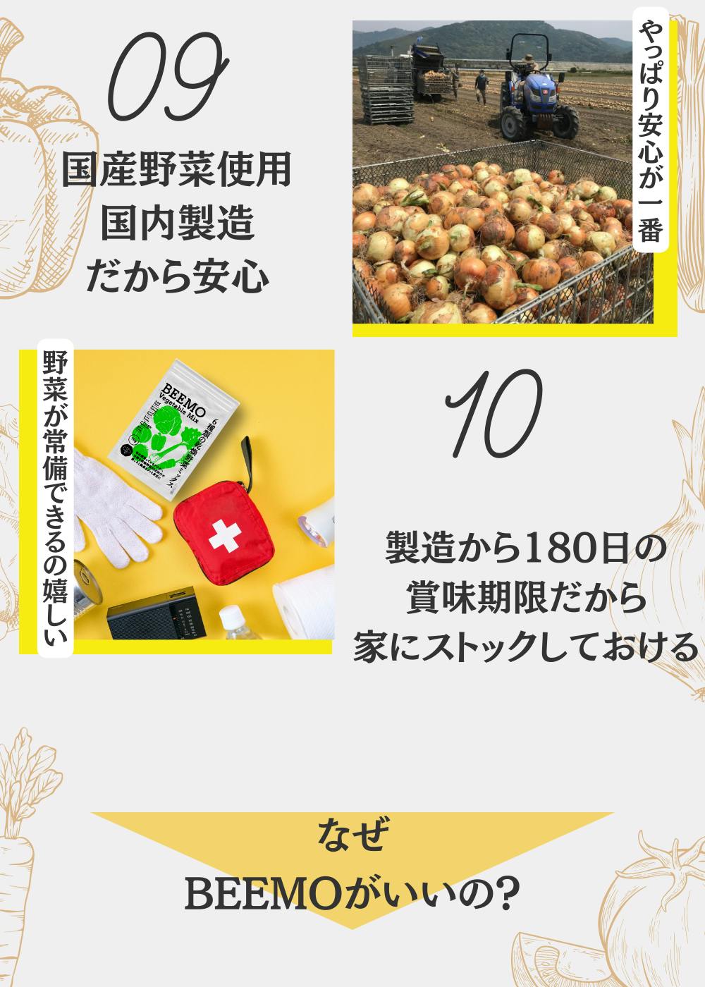 BEEMOは、国内のOEM先様で製造されており、国産の新鮮な野菜を使用しています。