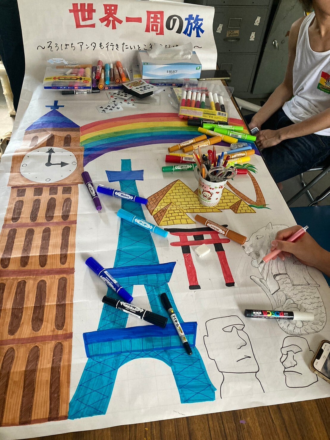 みんな夏休みに学校に来て、絵を描いたりペンキを塗ったりと頑張っていました。えらい!!