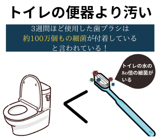 さらに、毎日使用する歯ブラシには菌が繁殖しやすい環境にさらされています!歯磨きをした後の歯ブラシには莫大な細菌が付着していると言われます。理由は歯ブラシでお口の中に残っている小さな食べ物のカスや歯の表面についている歯垢をこすって汚れを落とす為、使えば使うほどブラシの隙間に雑菌が繁殖ています。