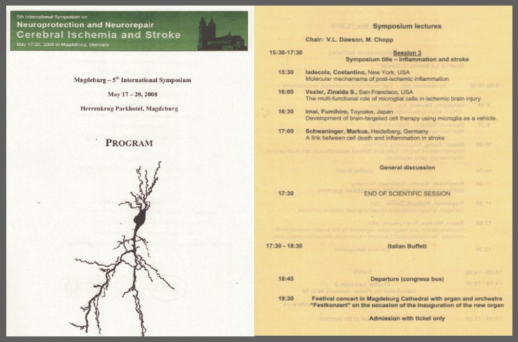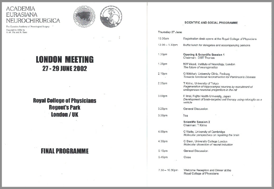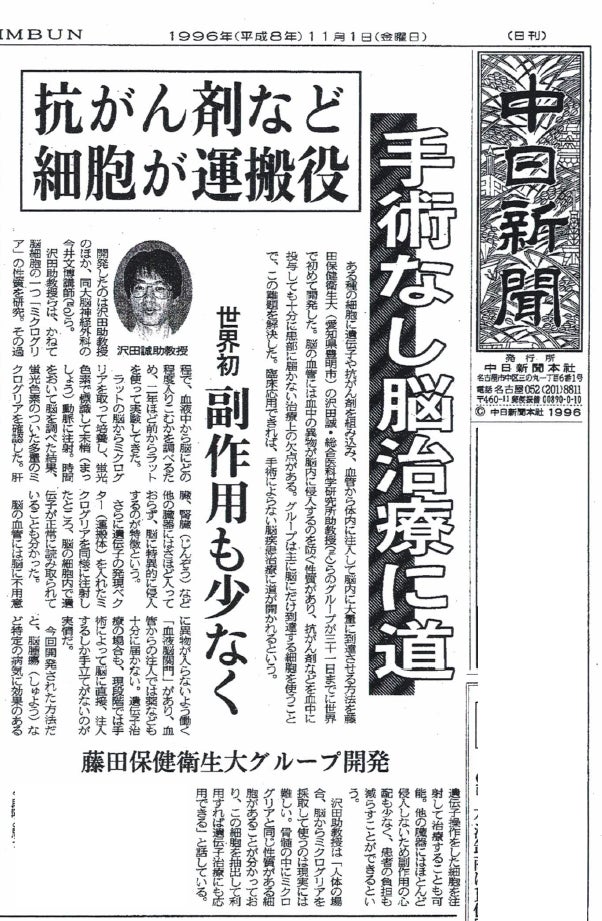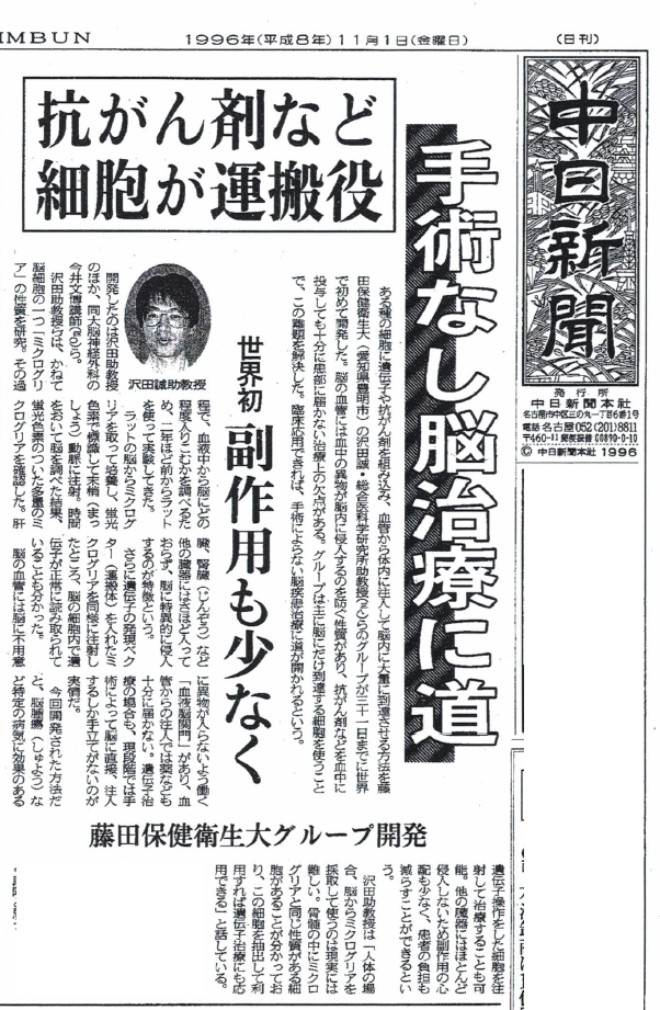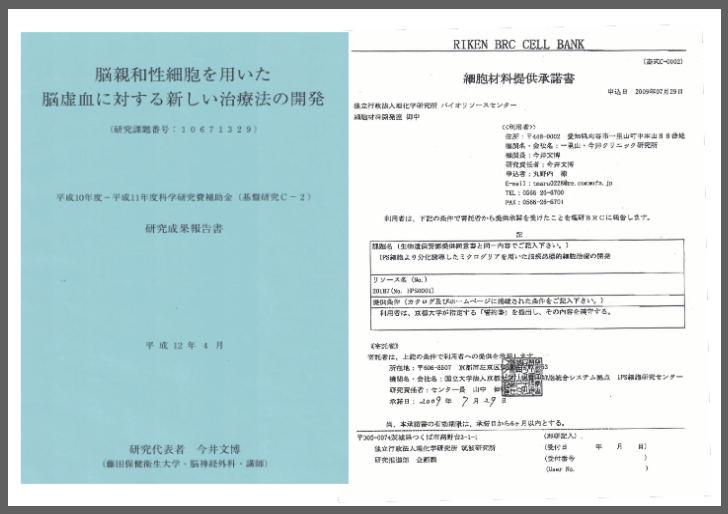 私は藤田医科大学在学中、同大学総合医科学研究所で同研究所の澤田 誠准教授(当時)とミクログリアの研究を始めました。1996年にはこの研究内容が中日新聞第1面に掲載されました。1997年培養ミクログリア細胞を動物の血中に投与すると、血液脳関門を通過して脳内に侵入することをNeuroscience letter 237: 49-52 に掲載しました。1998年「脳親和性細胞学を用いた脳虚血に対する新しい治療法の開発」のタイトルで文部科学省化学研究補助金(基礎研究C-2)を受けました。同年遺伝子導入したミクログリアを動物の血中に投与することにより、脳内に特異的に特定遺伝子を発現させることができることを、FEBS Letter 433:37-40 で報告しました。1999年には培養ミクログリアを虚血操作を施した動物の血中に投与すると、脳内に侵入したミクログリアが虚血海馬神経細胞周辺に遊走して集積することをNeuroscience letter 272: 127-20で報告しました。2000年9月バーミンガム, UKで開催された第14回国際神経病理学会にてミクログリアの研究報告をし、ベストポスタープレゼンテーション賞を受賞しました。2002年6月にはロンドンで開催されたACADEMIA EURASIANA NEUROCHIRURGICA LONDON MEETINGの招待講演で”Development of brain-targeted cell therapy using microglia as a vihicle" の講演をしました。これらの研究は2005年に当時の藤田保健衛生大学(現藤田医科大学)が採択された21世紀COEプログラム(The 21 st Century Center of Excellence Program: 文部科学省 研究拠点形成等補助金事業)の研究テーマにもなりました。2005年澤田 誠先生は藤田医科大学を退職し、名古屋大学環境医学研究所に移りました。私は2006年藤田医科大学を退職して同年8月1日一里山・今井クリニック(現在の一里山・今井病院:ミクログリア研究所を併設)を設立しました。2007年ミクログリアを一過性全脳虚血動物モデルの血中に投与すると、ミクログリアは虚血海馬神経細胞付近に遊走・集積し、神経細胞死を抑制することを形態学的・生理学的に証明しJournal of Cerebral Blood Flow & Metabolism(2007) 27, 488-500 に掲載しました。当時においてはミクログリアが神経損傷部に集積しているので、ミクログリアは神経に悪影響を与えるとの見解が主流でした。この論文はミクログリアが生体内において神経保護的作用を有することを世界で初めて証明した画期的な報告です。2008年5月にはドイツのマーブルグで開催された5th International Sympsium on Neuroprotection and Neurorepair Cerebral Ischemia and Strokeに招待され講演しました。2009年には独立法人理化学研究所 バイオリソースセンターにIPS細胞提供依頼をし、細胞材料提供承諾書を受理しました。