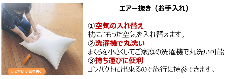 A.多少の羽毛の臭いは使用しているうちに消えるので心配いりませんが気になる方は枕を丸めて中の空気を抜き外気を吸わせて空気の入れ替えをして下さい。その後2時間ほど陰干しをして下さい。