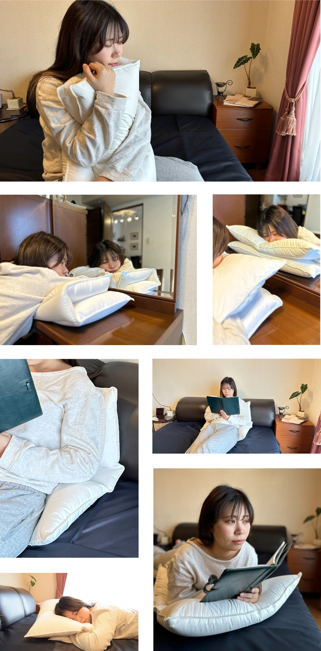 ベッドの上だけではなくソファーで使用したり長距離ドライブに持参したりと多様な場面でもご使用いただけます。また、折りたたんで鞄に入れればどこへでも持ち運ぶことが可能です。移動先(機内・車中・オフィス)でも快適な睡眠(仮眠)を得ることができます。