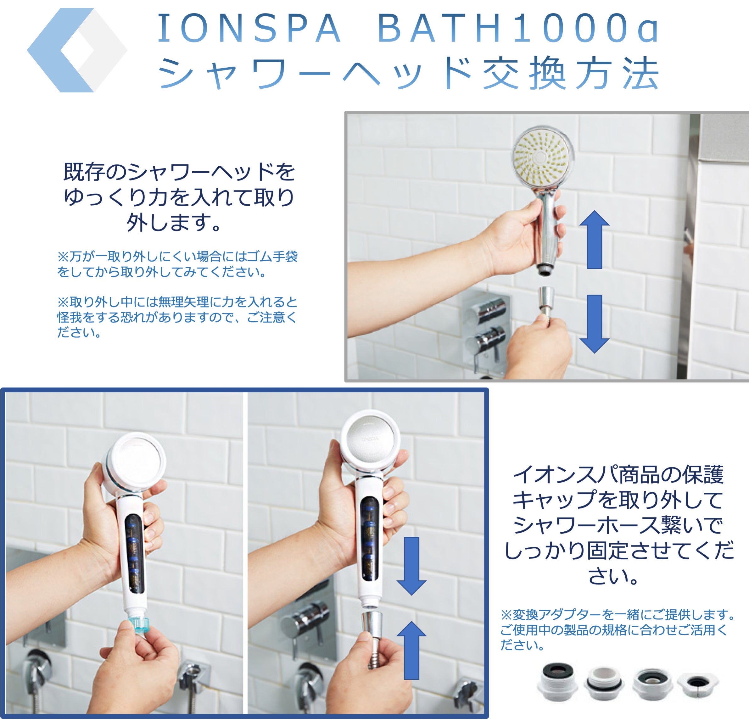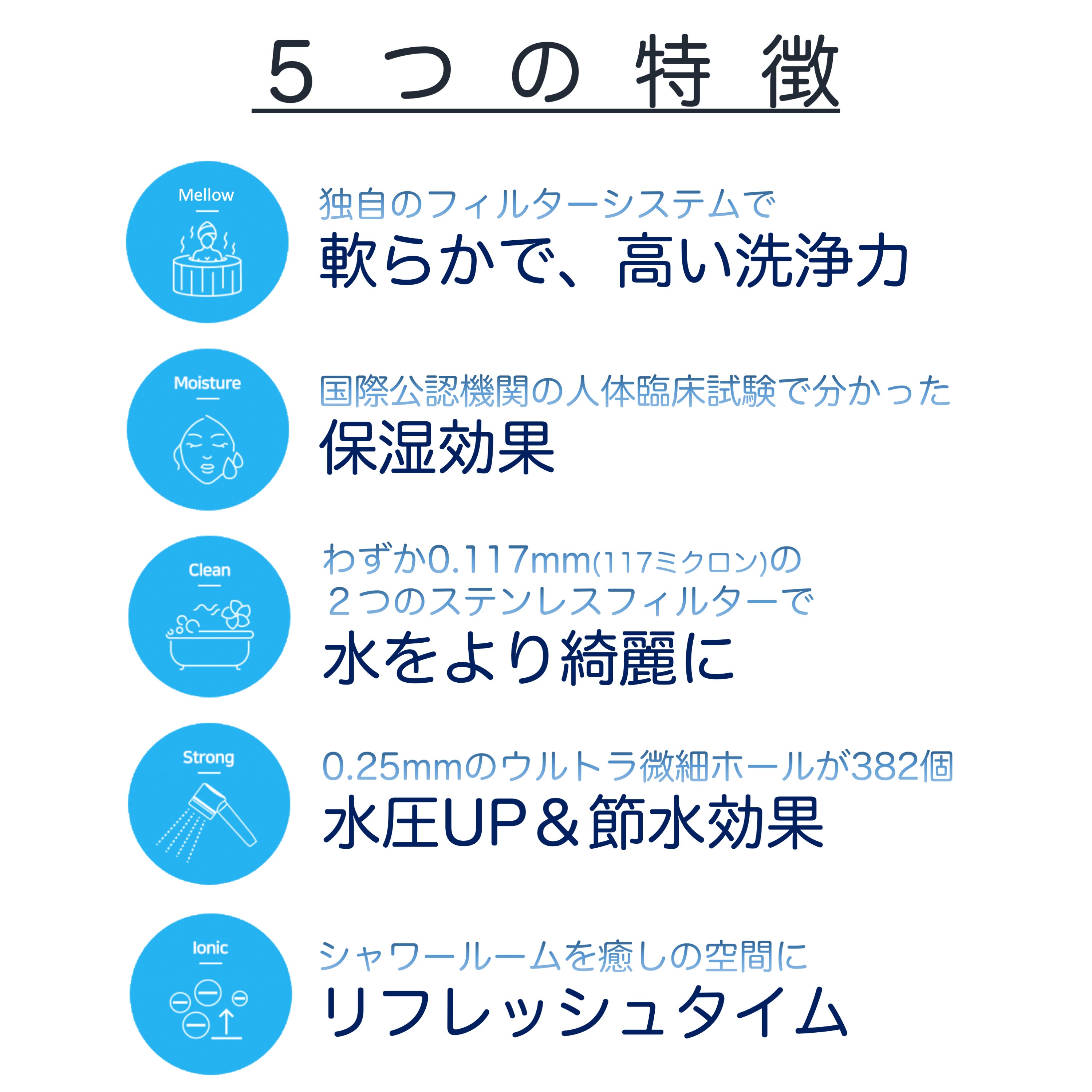 イオンスパは、単に洗うだけではなく、より優しく、綺麗で、健康的な水でシャワーを浴びようという考えのもと、以下の特徴を持って作られました。これからのシャワーの新常識となり得るイオンスパで、毎日のシャワータイムを楽しんでいただきたいです。