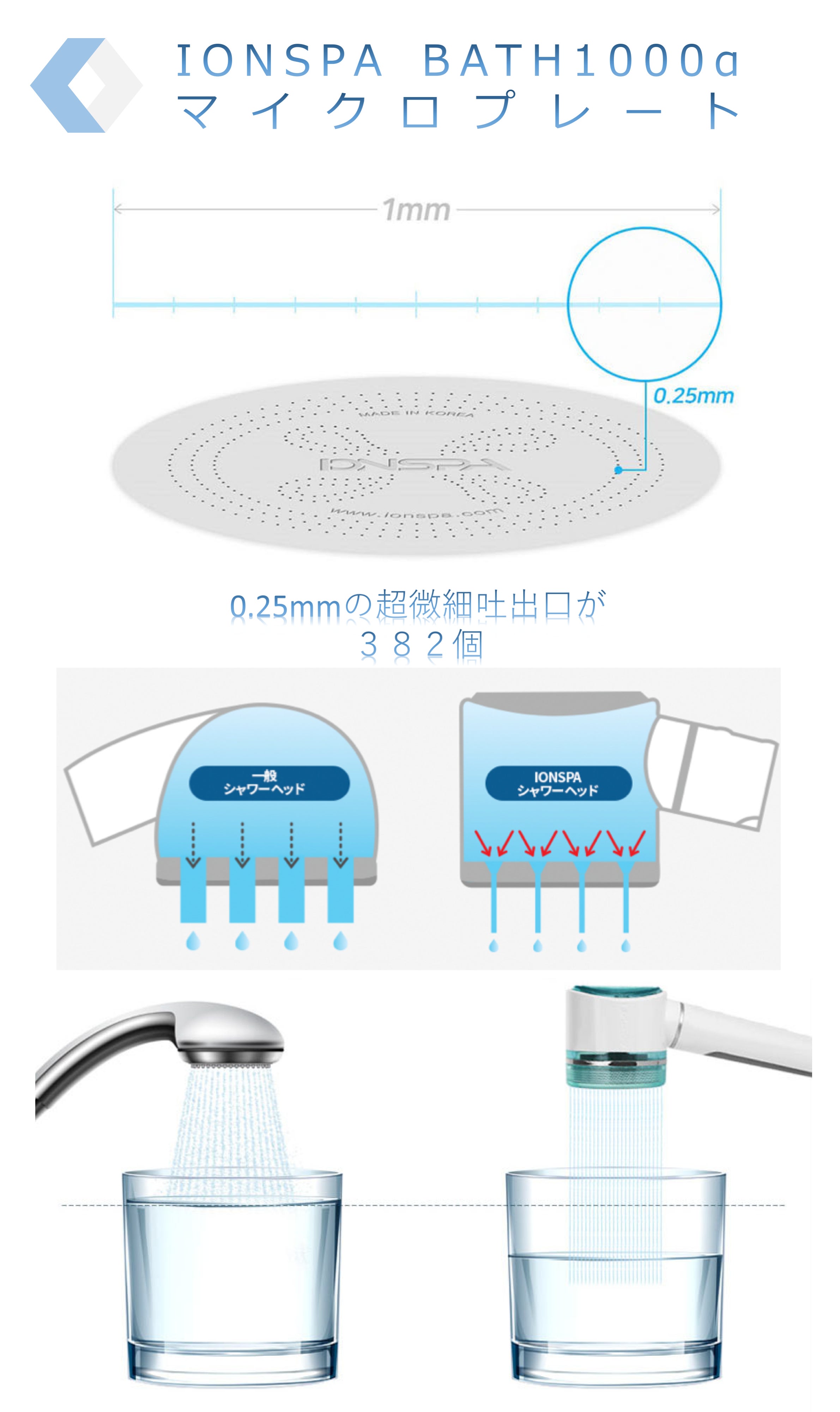 わずか0.25mmの382個のマイクロプレートホールを通った水が、きめ細かく優しく肌に当たり、水圧アップと同時に節水効果をもたらします。