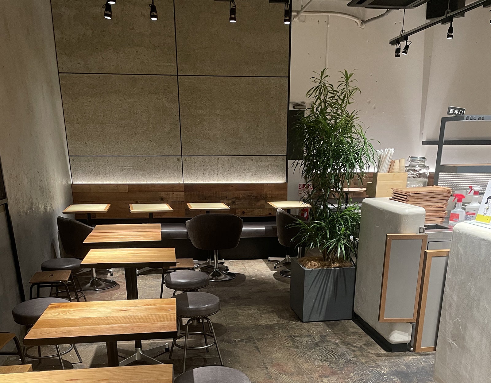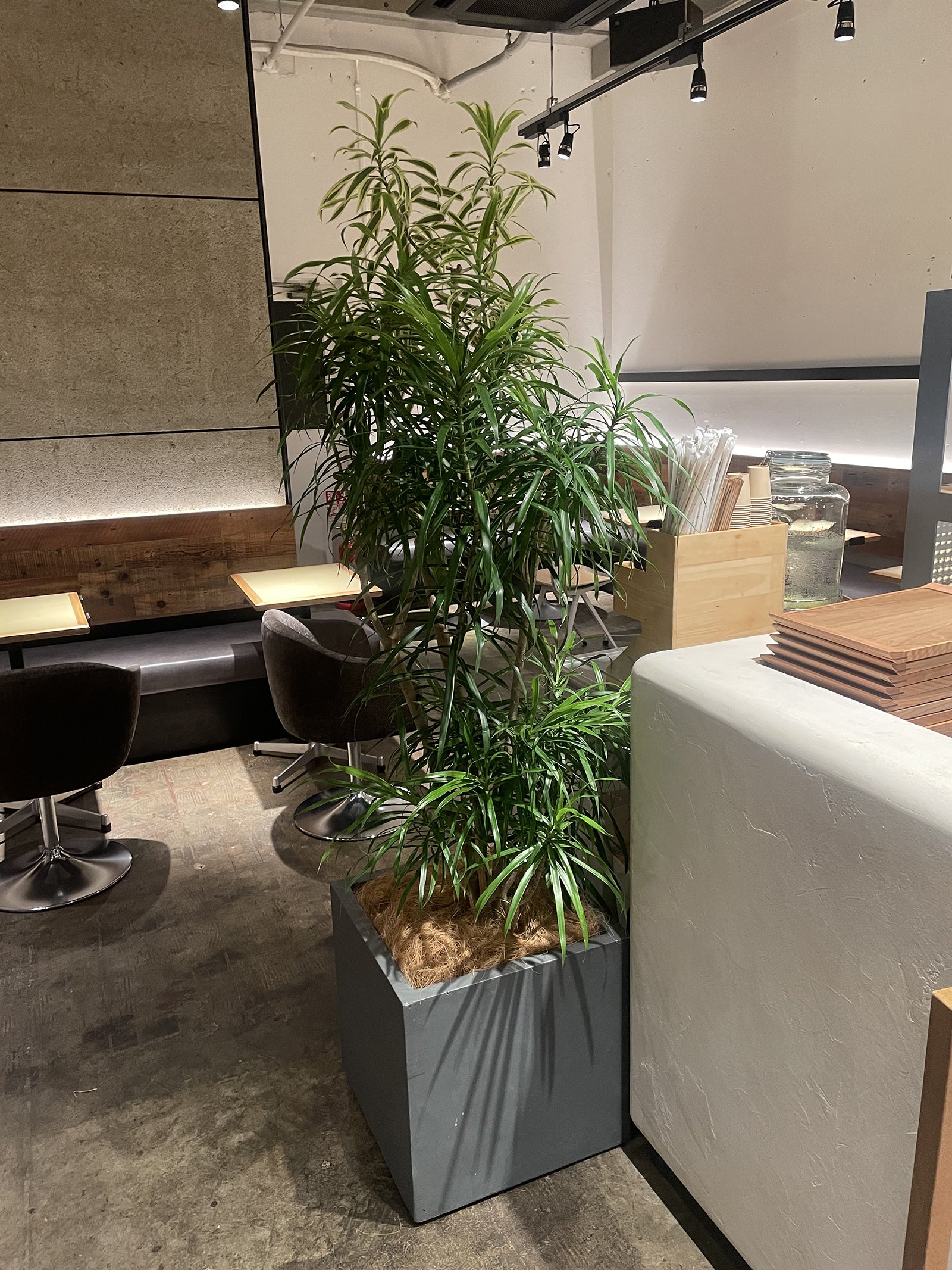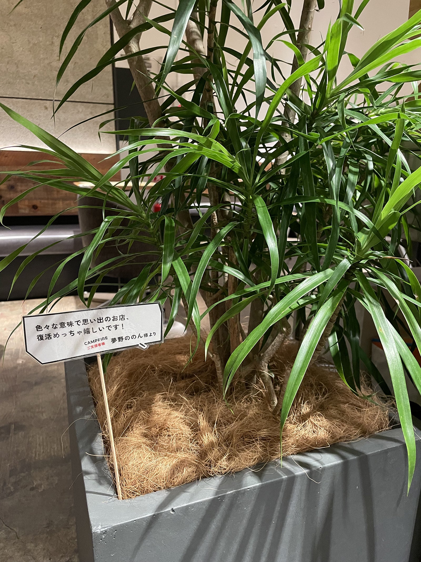 ご支援いただいた観葉植物をお店の真ん中にドーンと置かせていただきました。