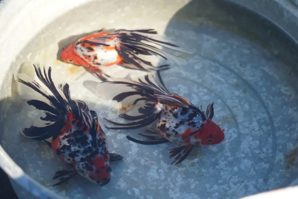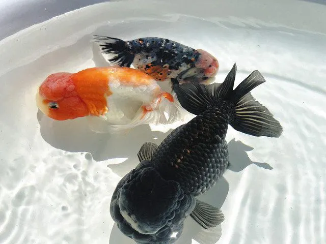 深見さんが作出した青いランチュウ(手前)や桜錦(中)