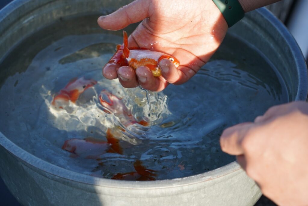 弥富市の養魚場が所有する金魚池を巡り、美しい金魚とその飼育環境を見学します。運営者である深見さんとの座談会を通じて、金魚飼育の知識を直接学んだり、地元弥富の金魚小売店を見学したり、貴重な体験が盛り沢山となっております!