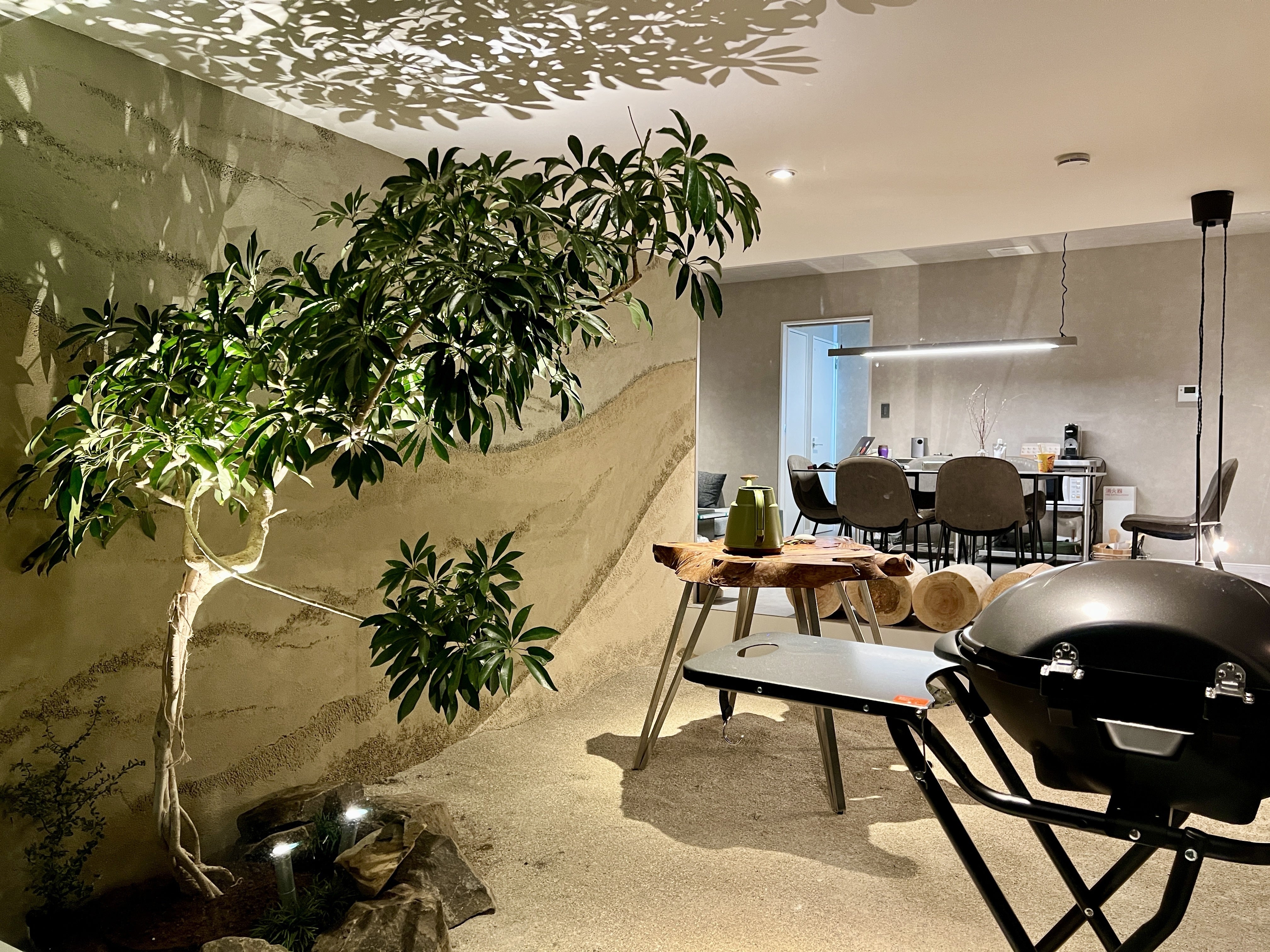 室内に土間、無垢材テーブル、丸太輪切りスツール、植栽が映し出す影。