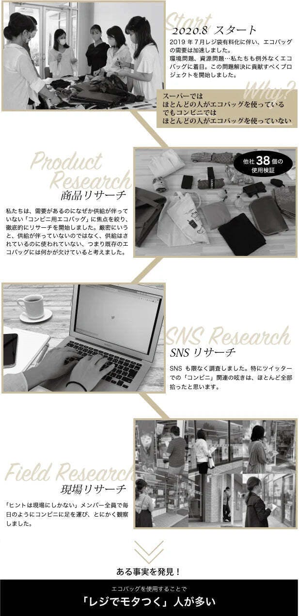 私たちは、打ち合わせとリサーチを繰り返す中、市場に出回っている既存のエコバッグに欠けている、もう1つの大事な要素に気がつきました。