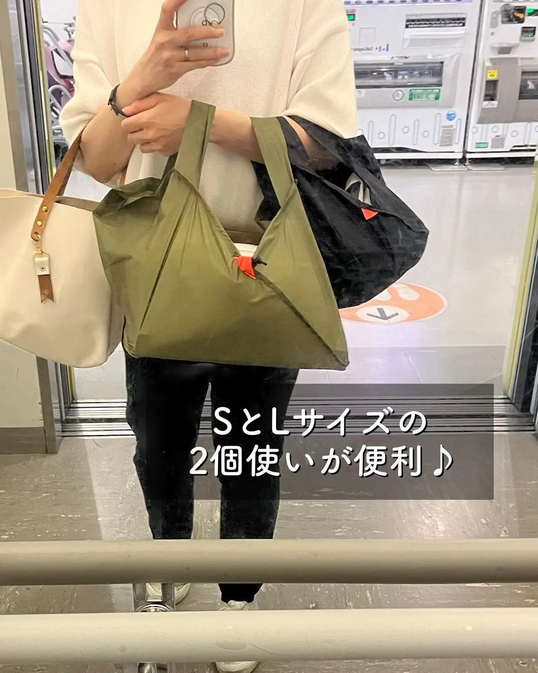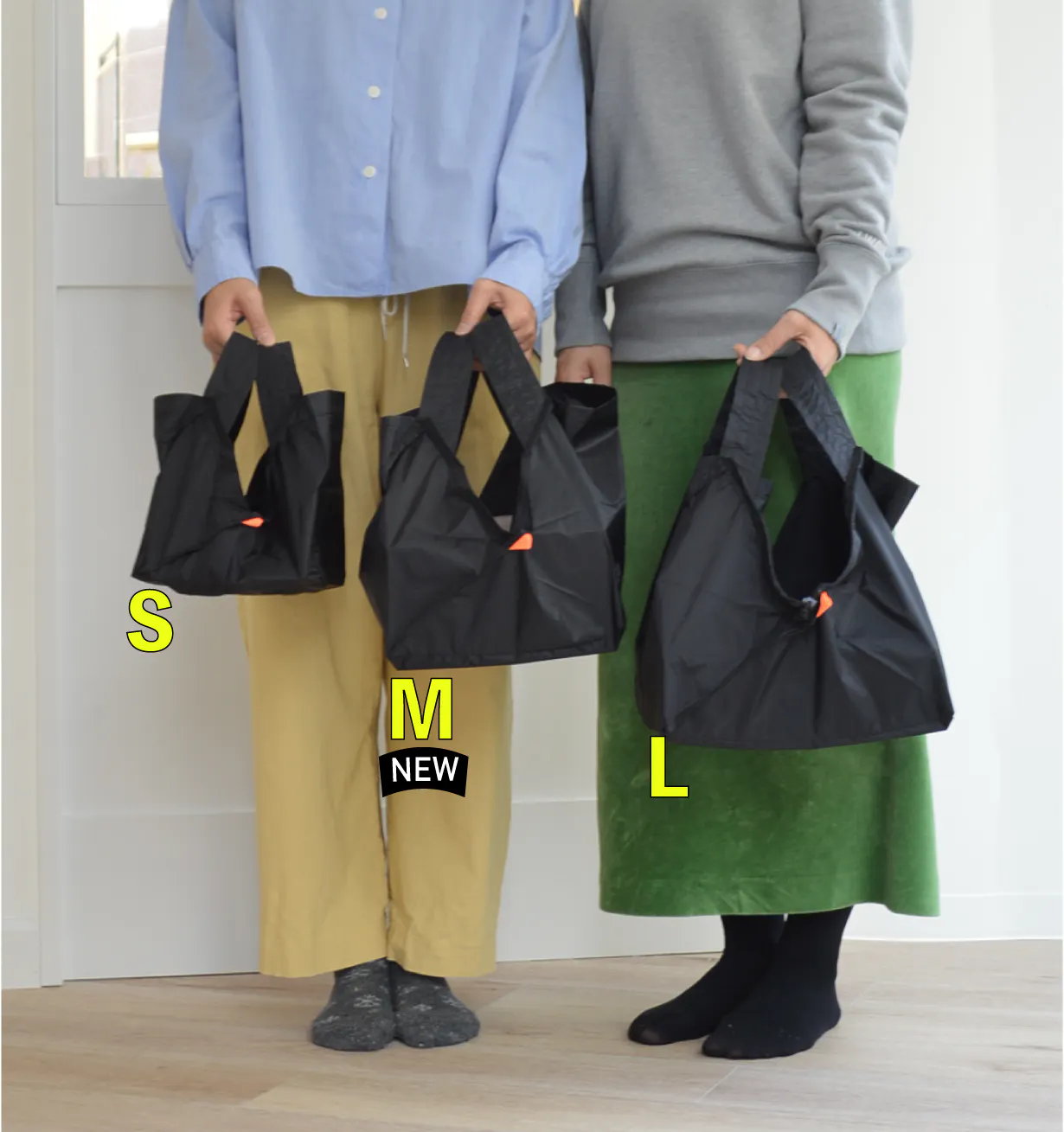 158cm女性が、ORIBAエコバッグSサイズ、Mサイズ、Lサイズを持った比較