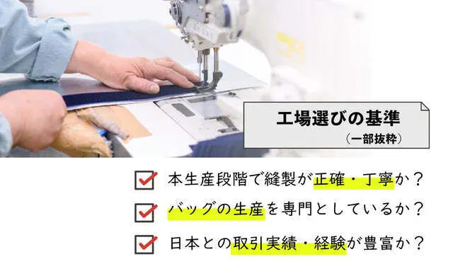 上記工夫は、ほんの一部の例ですが、この複雑な設計図を正確かつ丁寧に再現できる外国の工場は多くなく、国内工場ではコストの折り合いがつかない。最終的に、私たちが選んだのは、高級ブランドバッグの下請けもしている工場(中国)です。経営者が日本人で、バッグ・財布の製造(専門)にて20年以上の実績があります。