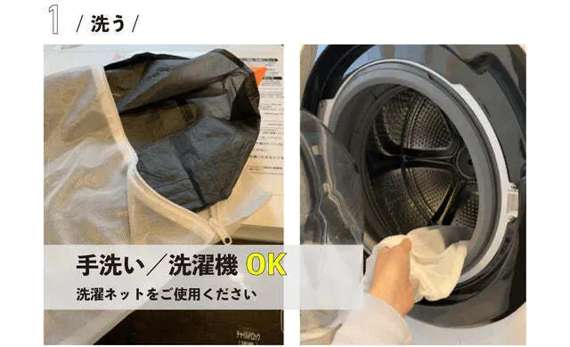 A:洗濯機で丸洗い出来ます。その場合は、洗濯ネットを使用して、中性洗剤で単独洗いしてください。 ※ 漂白剤は使わないでください。 ※ 洗濯後、日陰に干して乾燥させてください。