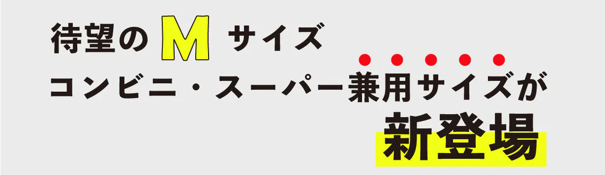 Sサイズはコンビニ用、Lサイズはスーパー用として、現在2サイズを展開しています。この度、たくさんのご要望をいただき、小さすぎず大きすぎない「ちょうど良い」Mサイズを販売することが決定しました!