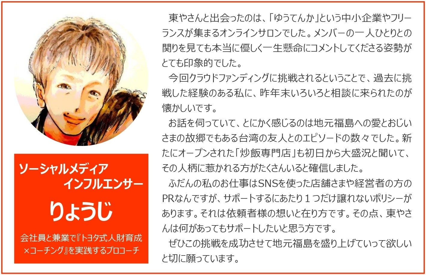 【新リターン追加のお知らせ】「応援メッセージを寄せてくださったインフルエンサーのりょうじさんが、新規リターンを考えてくださいました。実は私はお店の再オープンの際、りょうじさんに投稿文やプロフィールの添削を依頼。結果バズったおかげで、県内外問わずメディア関係者の方にも目を留めていただけるきっかけに。オススメは、【3名様限定の60分のSNSコンサルティング】です。私のクラウドファンディングへの応援の為の特別価格でご提供させていただきます。是非この機会に、インフルエンサーのコンサルティングを受けてみて下さい。