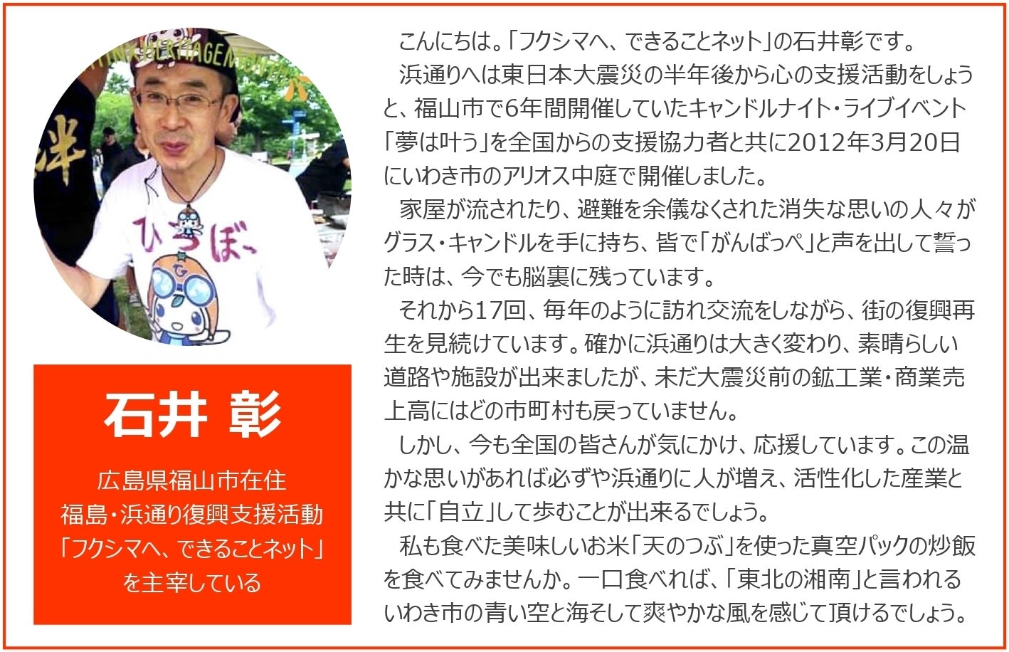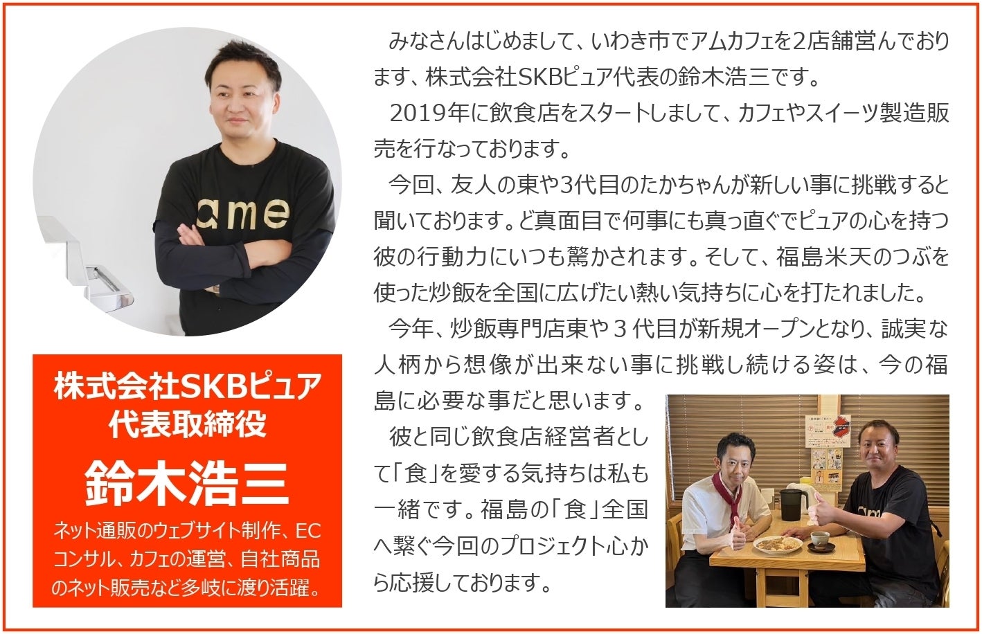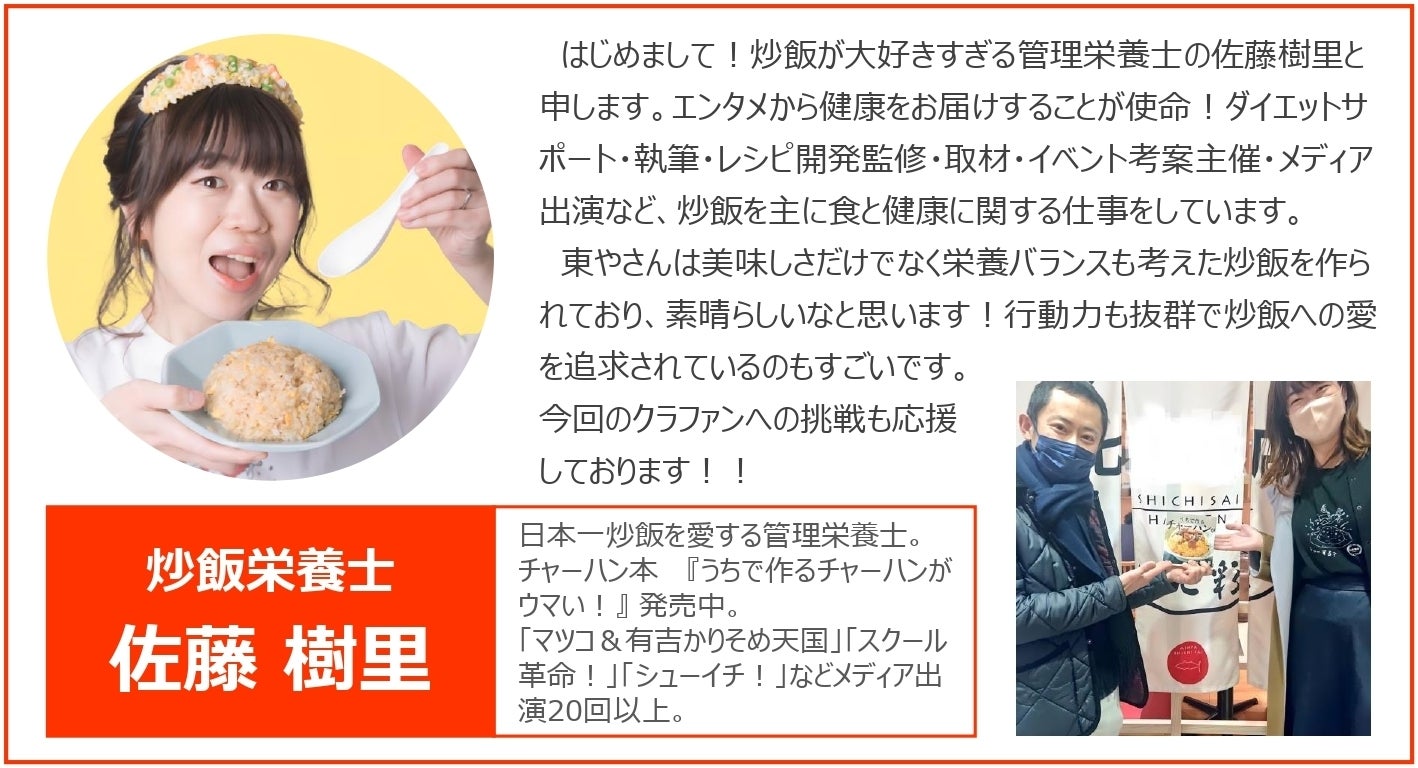 絶対に美味しい新しい炒飯を作り出しますので、完成しましたら、渾身の「恵みのカレー炒飯」をぜひ食べていただきたいです。福島は震災と風評被害に苦しむ現実がありますが、それを乗り越え、新しい美味しさを世界に広げる足掛かりになる事を目指しております。