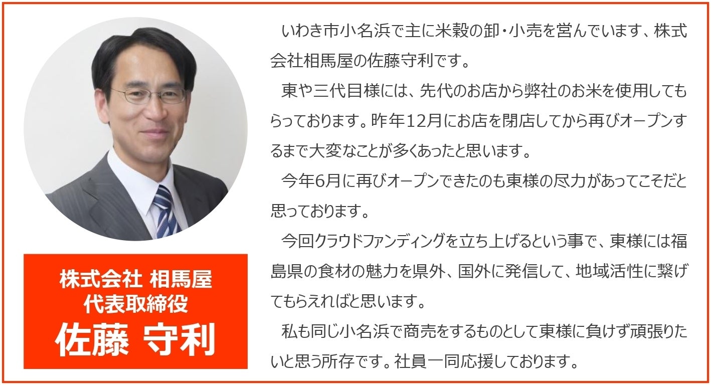 現在、試行錯誤して開発している「恵みのカレー炒飯」を、一般販売前にお届けするリターンをはじめ、炒飯専門店として再スタートした「東や3代目」で使用している福島県開発米「天のつぶ」の東やオリジナルパッケージ米や、東やお食事券等をご用意いたしました!