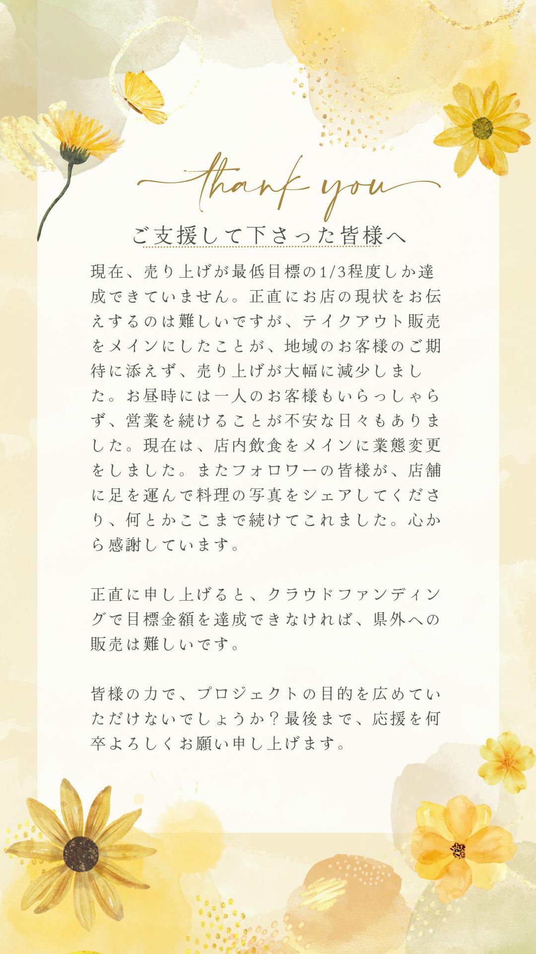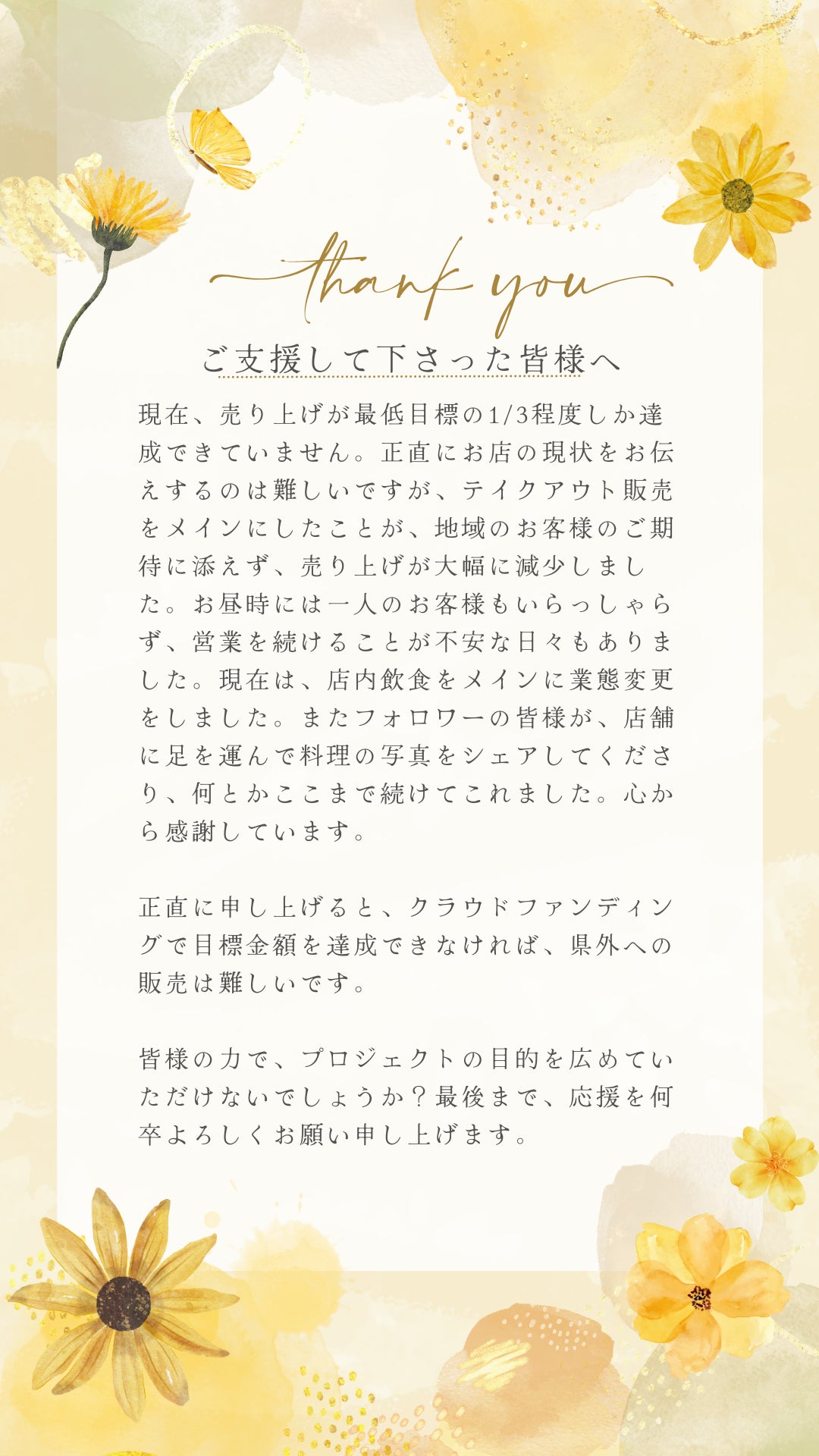 現在、売り上げが最低目標の1/3程度しか達成できていません。正直にお店の現状をお伝えするのは難しいですが、テイクアウト販売をメインにしたことが、地域のお客様のご期待に添えず、売り上げが大幅に減少しました。お昼時には一人のお客様もいらっしゃらず、営業を続けることが不安な日々もございました。