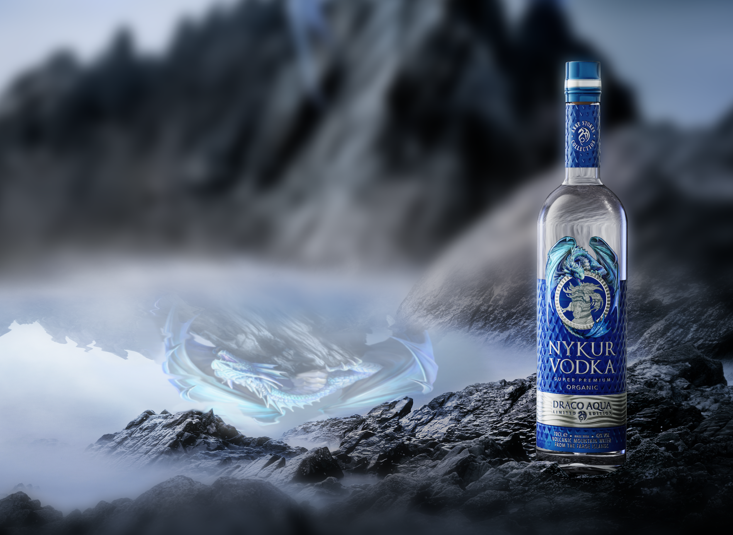 極上のプレミアムウォッカに付けられた「NYKUR」という名は、フェロー諸島に伝わる伝説の生き物の名前である。北欧のみならず多くのヨーロッパのゲルマン神話に登場するこの生き物は、地域によって呼び名もその姿も微妙に違うが、共通するのは、その魅力で出会った人々を惑わし虜にするということだ。フェロー諸島に伝わる「NYKUR(ニュクア)」は煌めく灰色の馬の姿をしており霧深い水辺に湖の底から現れる。NYKURと出会った旅人たちは、その美しさに魅了され触れずにはいられない。そうこうするうちにその美しい馬に跨ってみたい誘惑に勝てず騎馬するとNYKURはたちまち旅人を乗せたまま湖へと引き摺り込み、水の墓場へ連れ去られた者は永遠に閉じ込められる事となる。