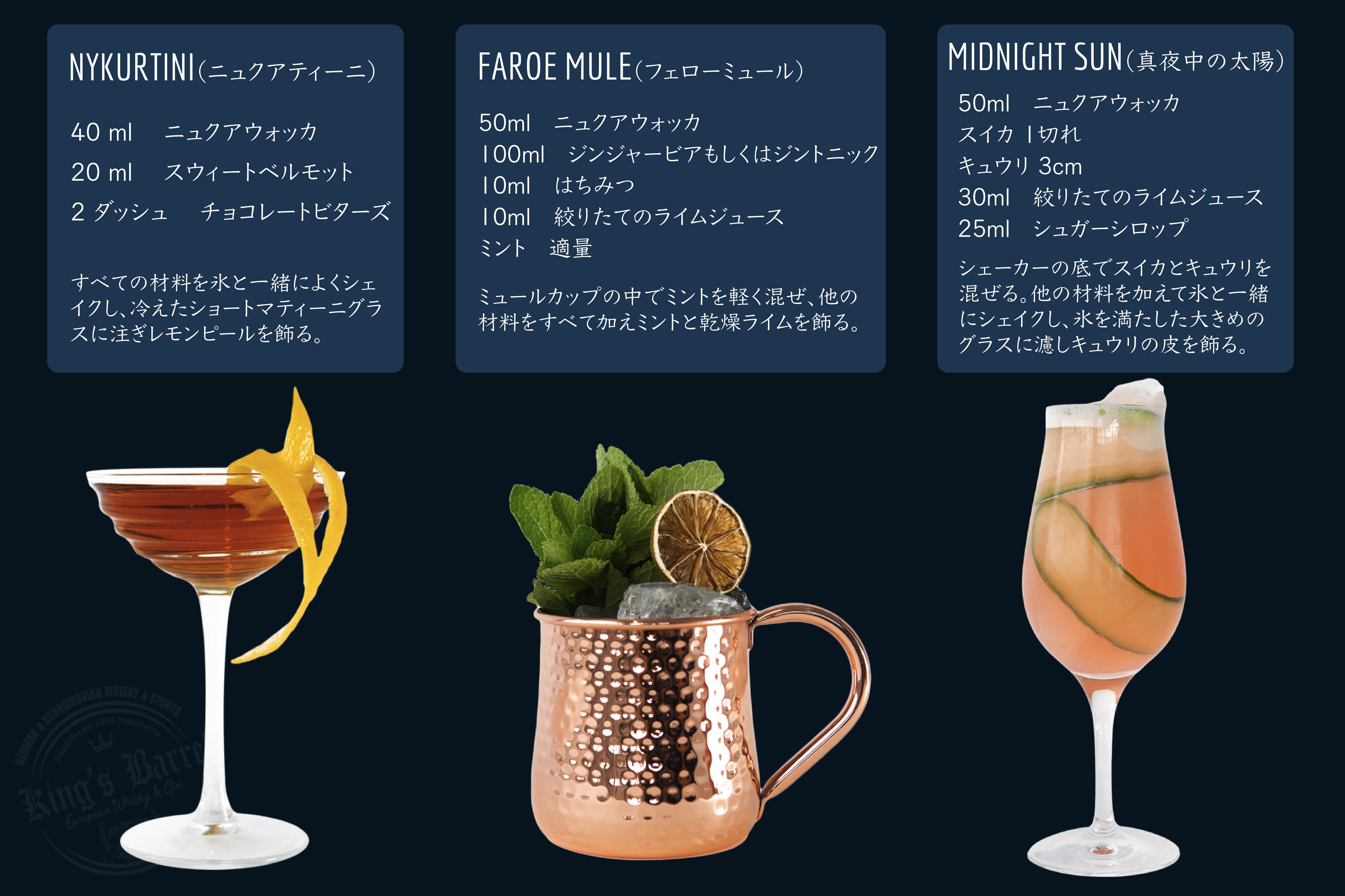 そんな、最初はぜひ室温でストレートでお試し頂きたいプレミアムウォッカ「ニュクア」だが、もちろん他のウォッカ同様様々なカクテルとしてもお楽しみ頂ける。KING’s BARREL(キングズバレル)のおすすめはストレートも良いがシンプルに炭酸水と割ると非常に飲みやすくて飲み過ぎるほどだ。ビールの代わりにぜひお試しいただきたい。シルキーなウォッカは寿司や刺身にもぴったりだ。