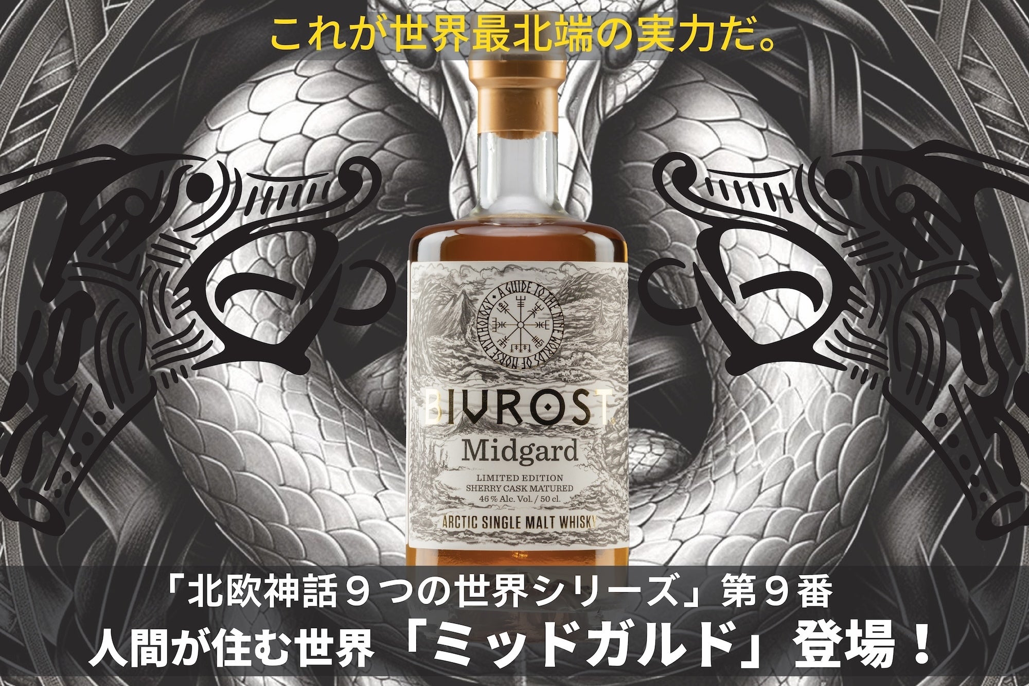 ノルウェー北極圏の世界最北端蒸溜所「オーロラ・スピリット」が氷河の水と北極大麦で作る大人気のリミテッドウイスキーシリーズ「北欧神話9つの世界」の最終章となる「ミッドガルド」ウイスキーの日本先行販売がスタートしました!