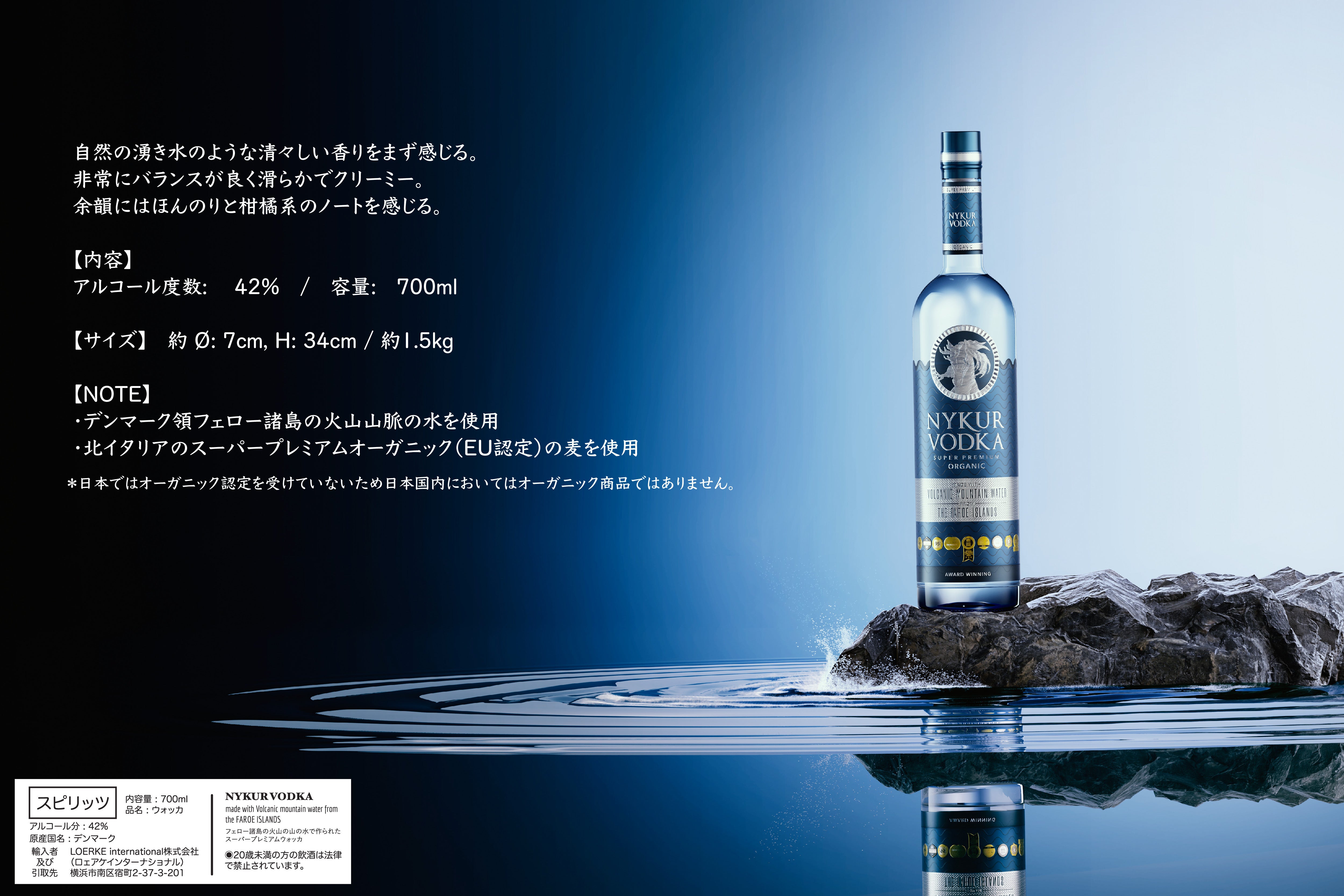 *「ニュクアウォッカ」はEUにてオーガニック認定されたウォッカですが、日本ではオーガニック認定を受けていないため、日本国内においてはオーガニック商品ではありません。