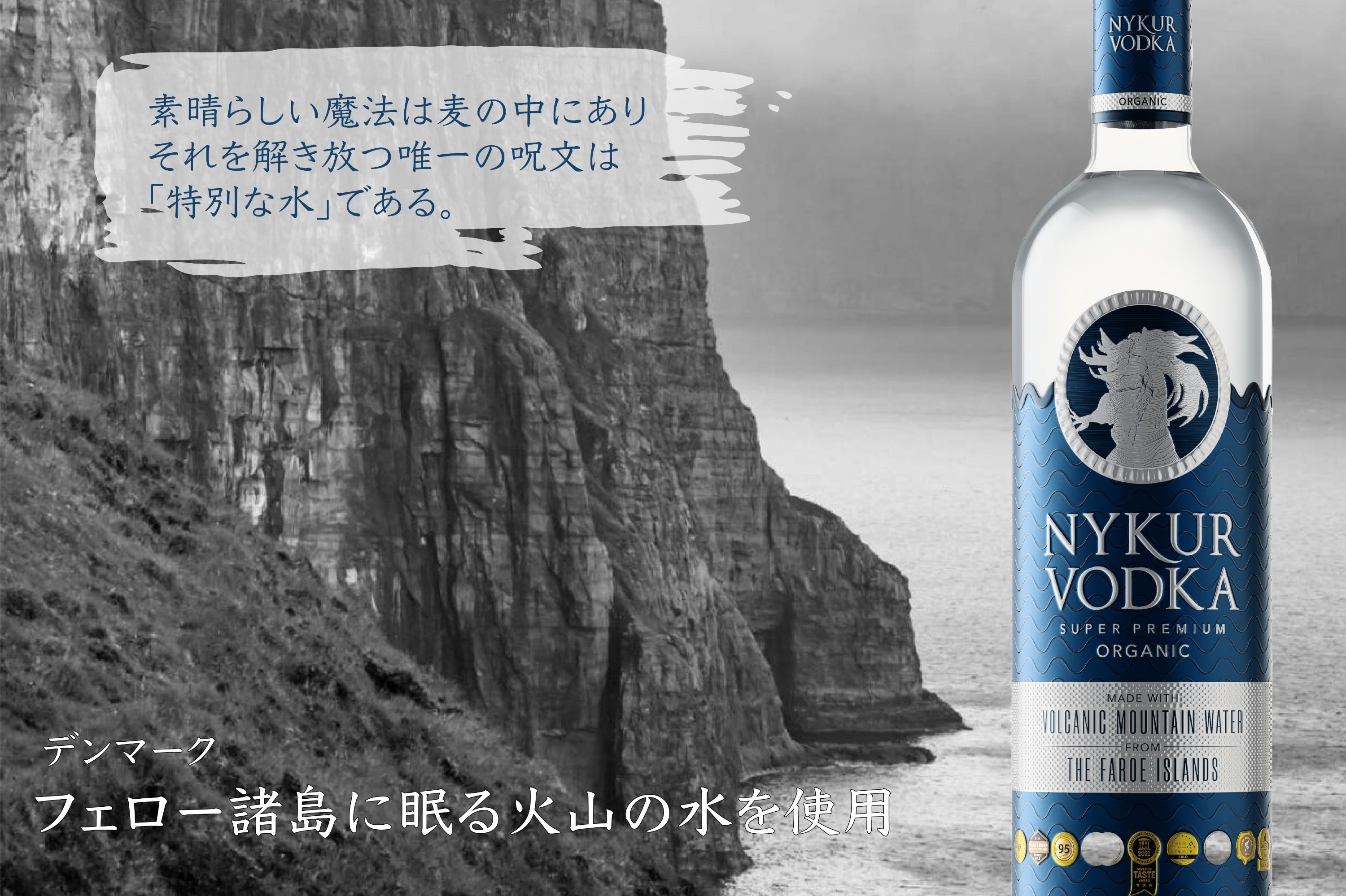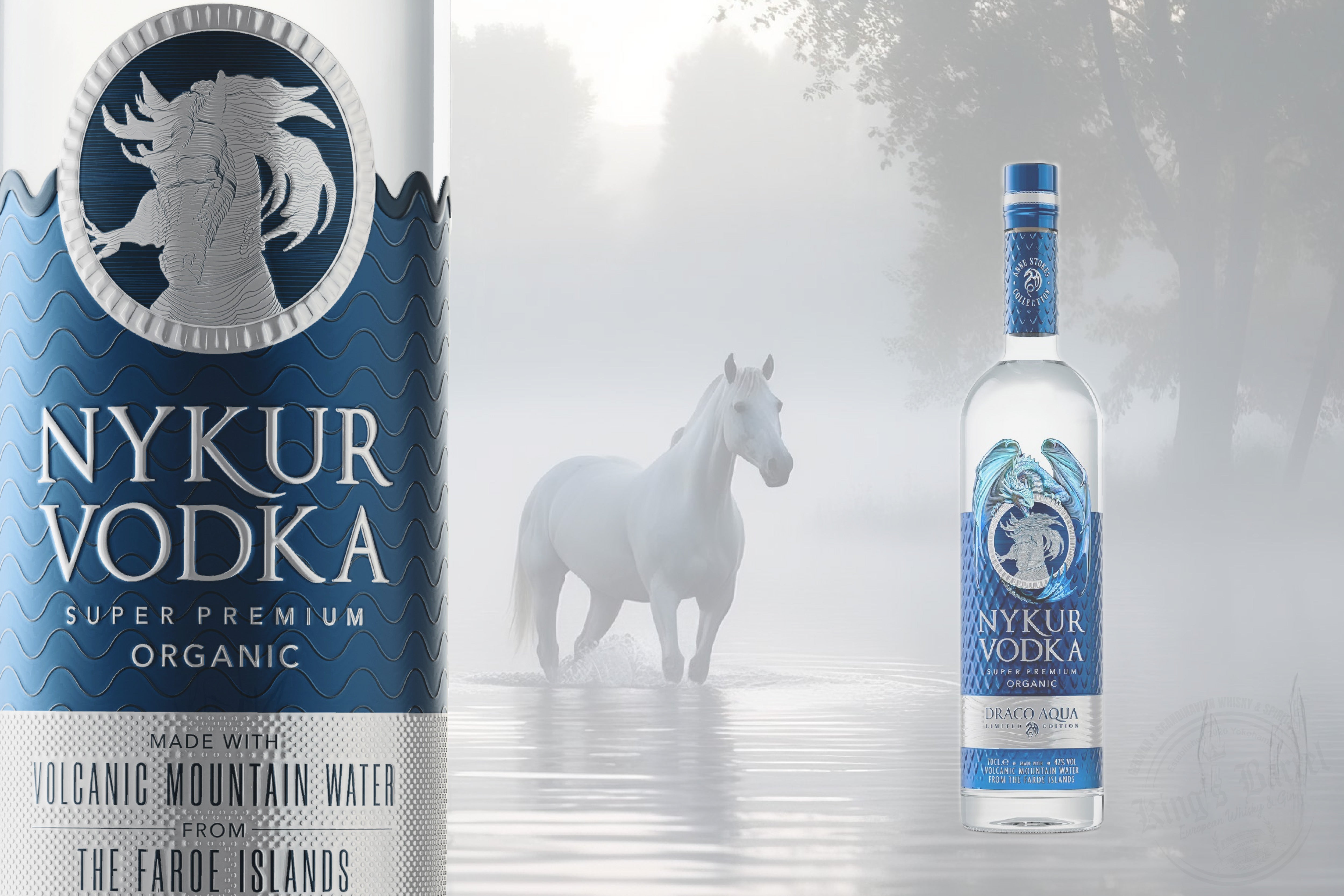 極上のプレミアムウォッカに付けられた「NYKUR」という名は、フェロー諸島に伝わる伝説の生き物の名前である。北欧のみならず多くのヨーロッパのゲルマン神話に登場するこの生き物は、地域によって呼び名もその姿も微妙に違うが、共通するのは、その魅力で出会った人々を惑わし虜にするということだ。フェロー諸島に伝わる「NYKUR(ニュクア)」は煌めく灰色の馬の姿をしており霧深い水辺に湖の底から現れる。NYKURと出会った旅人たちは、その美しさに魅了され触れずにはいられない。そうこうするうちにその美しい馬に跨ってみたい誘惑に勝てず騎馬するとNYKURはたちまち旅人を乗せたまま湖へと引き摺り込み、水の墓場へ連れ去られた者は永遠に閉じ込められる事となる。