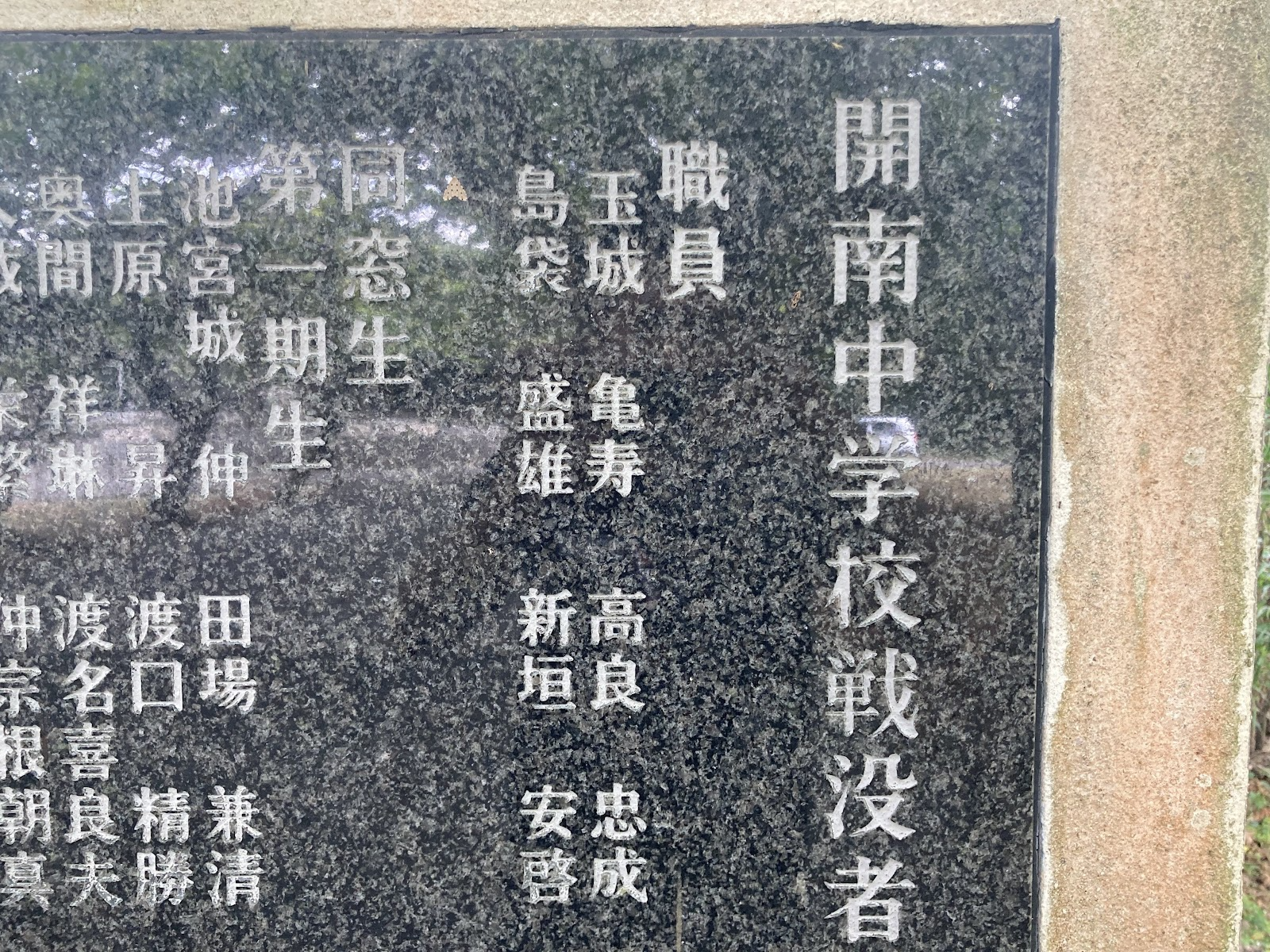 1935年に沖縄県で初の私立中学として開校した開南中学校で教師をしていた玉城亀壽は、生徒とともに戦場へと駆り出され命を落としました。平和創造の森公園(糸満市字米須1441-3)の一角にある開南健児之塔に刻銘されています。