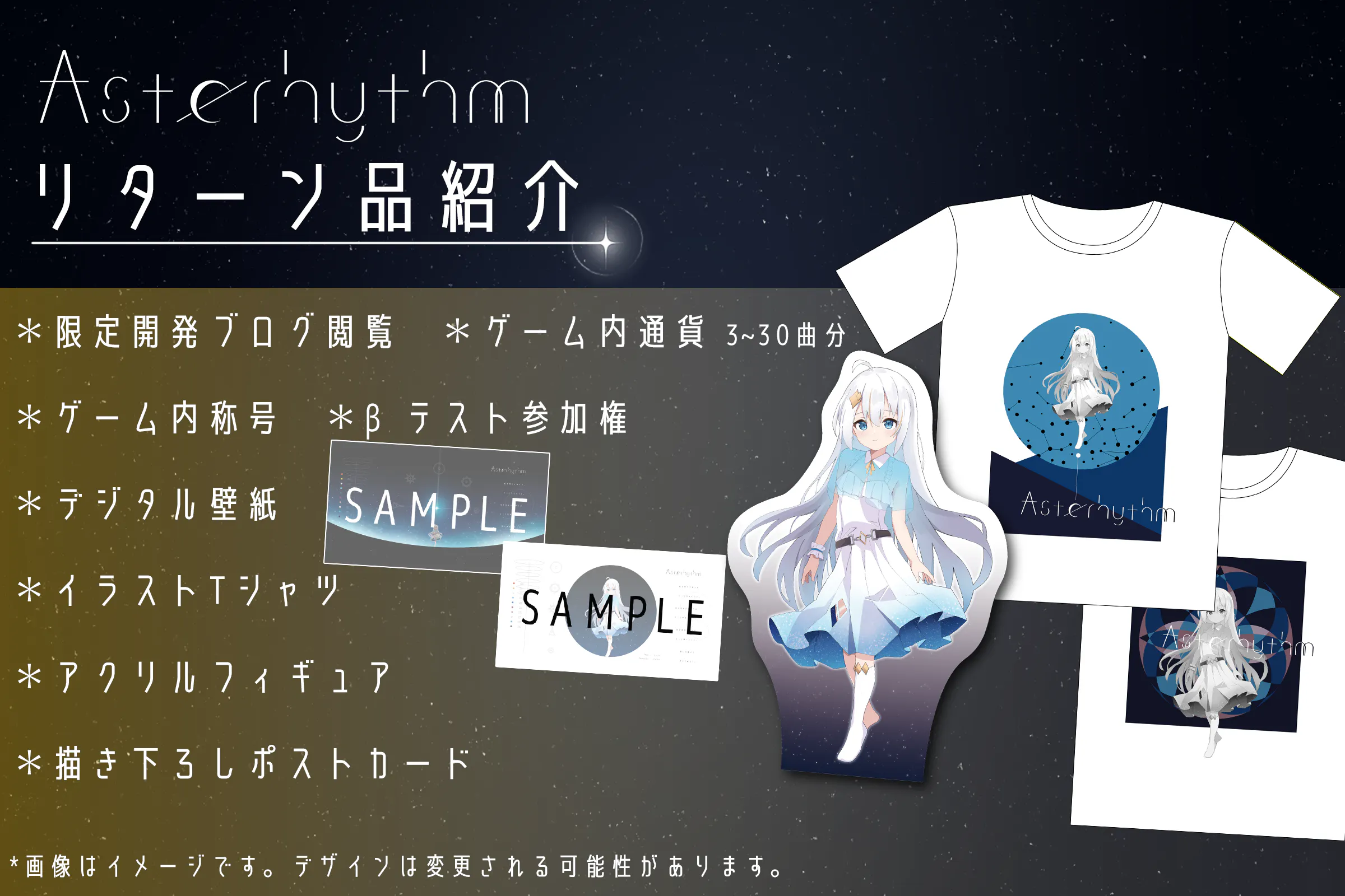 今回用意させていただくグッズ類にて、Asterhythmの世界観の一部を感じていただけると幸いです。(キャラクター・UIデザインなどをはじめとした制作状況についても、開発ブログで公開していく予定です!)