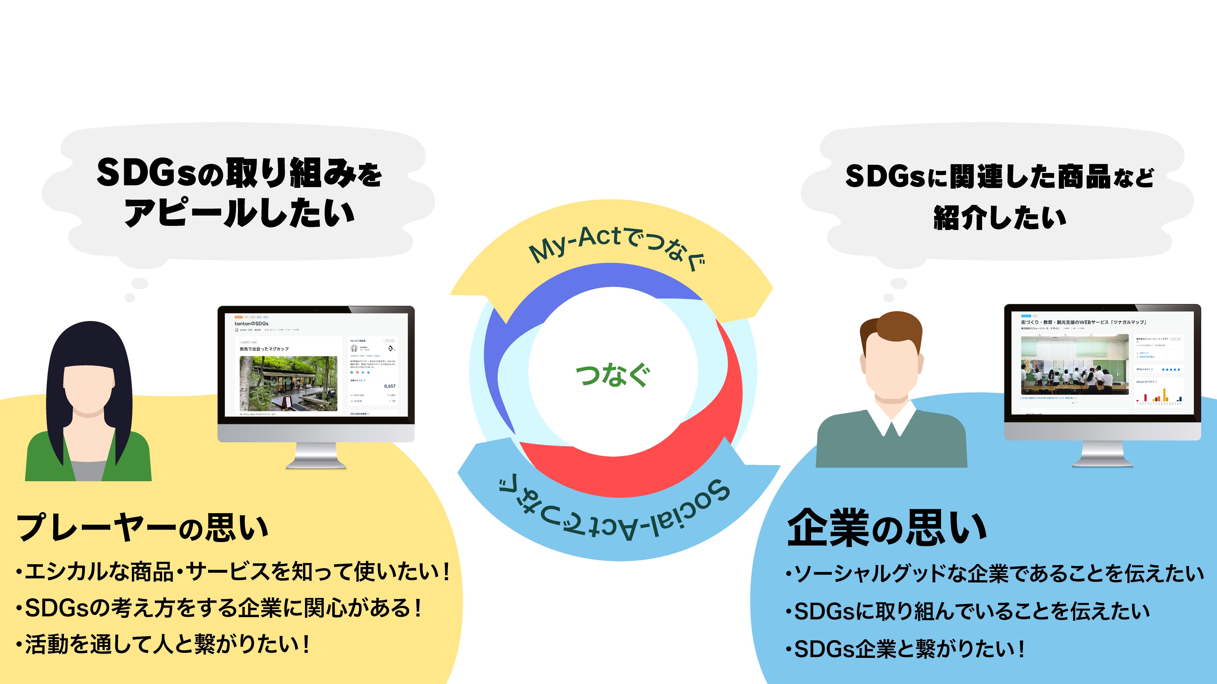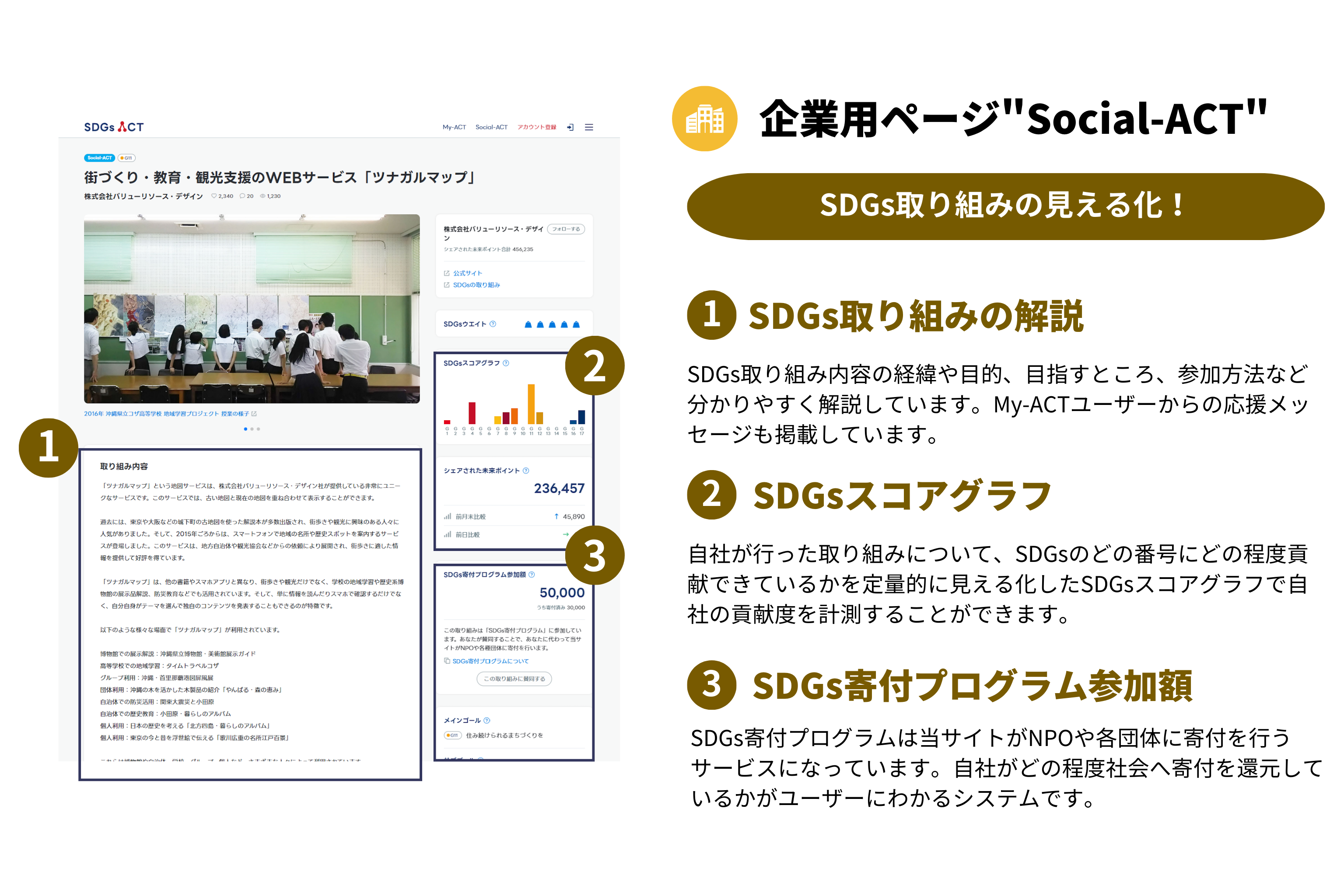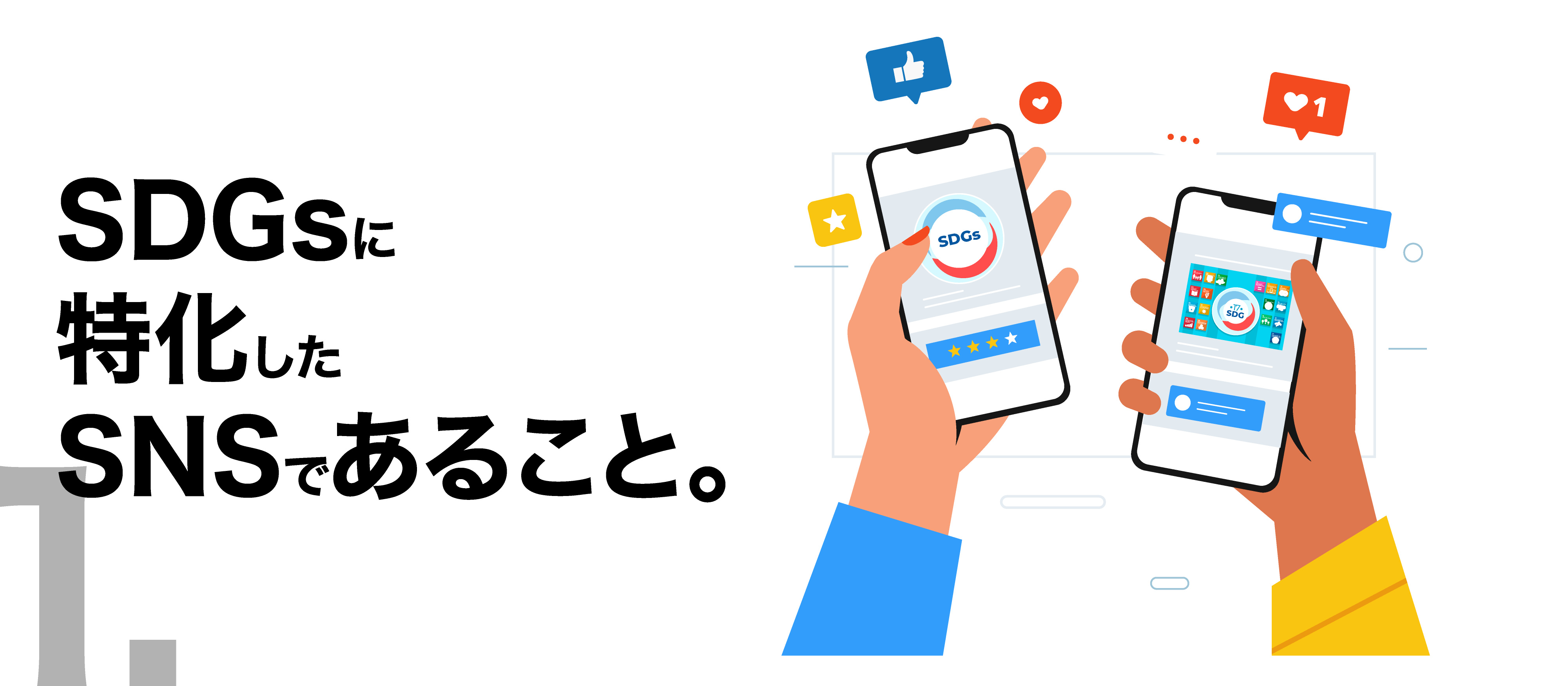 SDGs特化型SNS「SDGs-ACT」は上記の2つのアカウントを軸として構成されています。