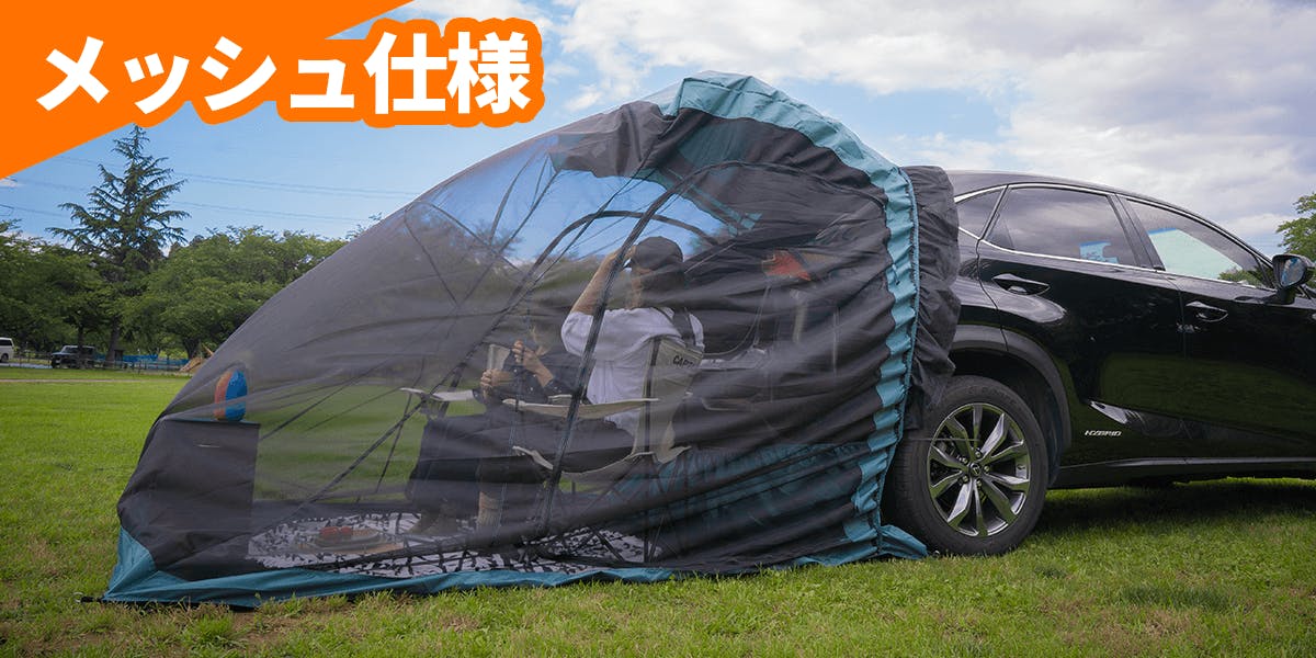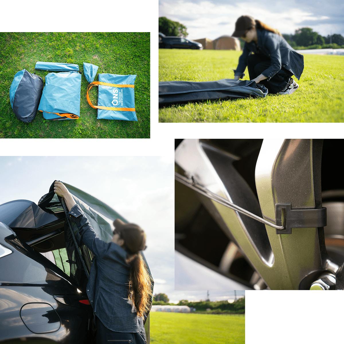 手軽で簡単な車接続式のテント! 女性1人でも簡単に設営できます!