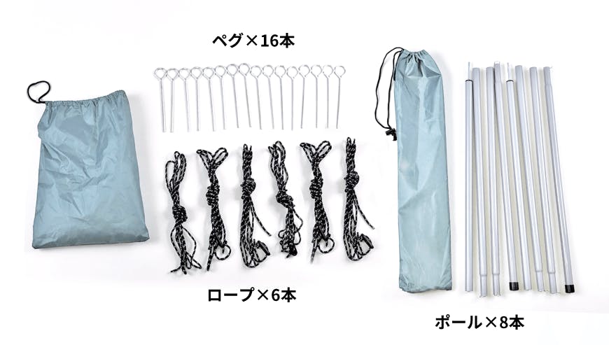 テント本体、全面カバー(タープに使用可能)、ロープ×6本、ポール×8本、ペグ×16本、収納バッグ