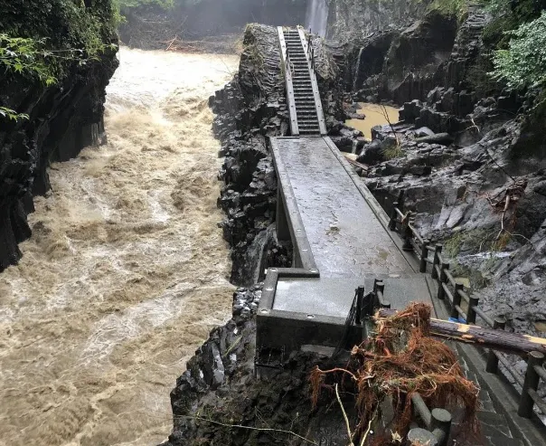 観光スポットの高千穂峡の遊歩道は増水により手すりが流され、流木や岩が道を塞ぎ、以前の姿をとどめていません。