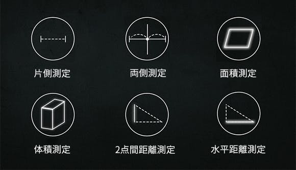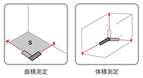 面積測定モードまたは体積測定モードに設定し、空間の長さ、広さ、高さを順に測ることで、DP20は自動的に平面/空間の面積/体積を計算できます。